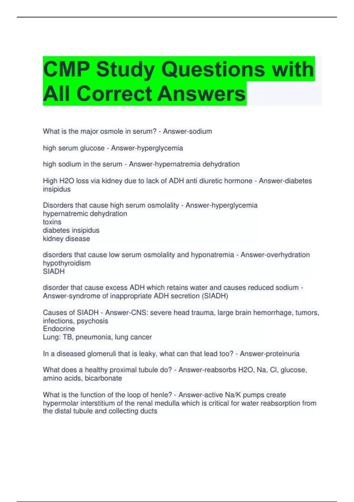 CMP Study Questions with All Correct Answers What is the major osmole in serum? - Answer-sodium high serum glucose - Answer-hyperglycemia high sodium in the serum - Answer-hypernatremia dehydration High H2O loss via kidney due to lack of ADH anti diuretic hormone - Answer-diabetes insipidus Disorders that cause high serum osmolality - Answer-hyperglycemia hypernatremic dehydration toxins diabetes insipidus kidney disease disorders that cause low serum osmolality and hyponatremia - Answer-overhydration hypothyroidism SIADH disorder that cause excess ADH which retains water and causes reduced sodium - Answer-syndrome of inappropriate ADH secretion (SIADH) Causes of SIADH - Answer-CNS: severe head trauma, large brain hemorrhage, tumors, infections, psychosis Endocrine Lung: TB, pneumonia, lung cancer In a diseased glomeruli that is leaky, what can that lead too? - Answer-proteinuria What does a healthy proximal tubule do? - Answer-reabsorbs H2O, Na, Cl, glucose, amino acids, bicarbonate