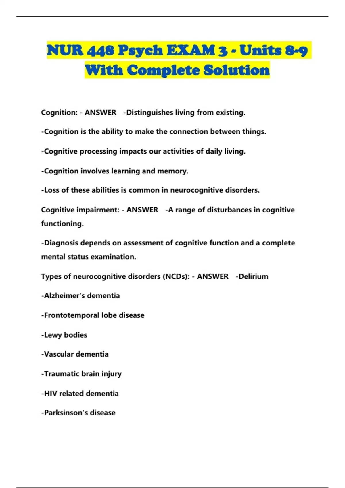 Cognitive impairment: - ANSWER -A range of disturbances in cognitive