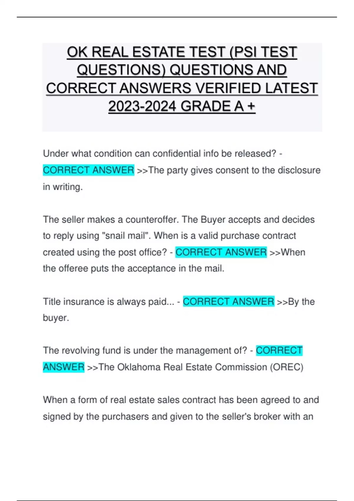 Title insurance is always paid... - CORRECT ANSWER >>By the