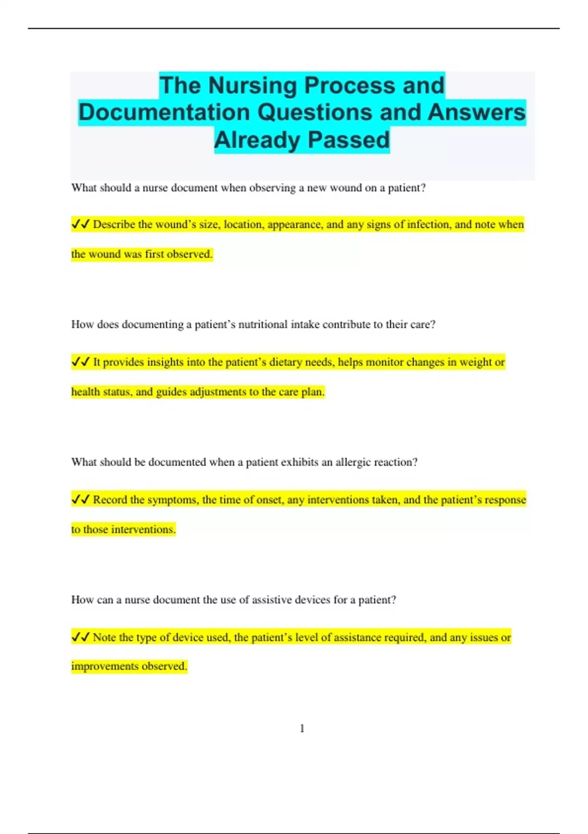 The Nursing Process and Documentation Questions and Answers Already Passed What should a nurse document when observing a new wound on a patient? Describe the wound’s size, location, appearance, and any signs of infection, and note when the wound was first observed. How does documenting a patient’s nutritional intake contribute to their care? It provides insights into the patient’s dietary needs, helps monitor changes in weight or health status, and guides adjustments to the care plan. What should be documented when a patient exhibits an allergic reaction? Record the symptoms, the time of onset, any interventions taken, and the patient’s response to those interventions. How can a nurse document the use of assistive devices for a patient? Note the type of device used, the patient’s level of assistance required, and any issues or improvements observed. 2 What is the significance of documenting patient consent for medications? It confirms that the patient has been informed about the medication, understands its purpose, and agrees to its administration. How should a nurse document the outcome of a patient’s follow-up visit? Include the patient’s progress, any changes in their condition, and updates to the care plan based on the follow-up assessment. What information should be included when documenting a patient’s emotional state? Describe observed behaviors, reported feelings, any contributing factors, and how the emotional state affects the patient’s overall care. How does documenting patient goals help in the nursing process? It provides clear, measurable objectives for care, helps track progress, and ensures that the care plan aligns with the patient’s needs and preferences. What should a nurse document after a patient’s discharge? Record the discharge instructions given, any follow-up appointments scheduled, and the patient’s understanding of their post-discharge care plan. 3 Why is it important to document family involvement in patient care? It acknowledges the role of family in supporting the patient, ensures that family concerns are addressed, and helps coordinate care with family members. What are the key components of the nursing process? Assessment, Diagnosis, Planning, Implementation, and Evaluation. How should a nurse document an assessment finding? Record the observation objectively,