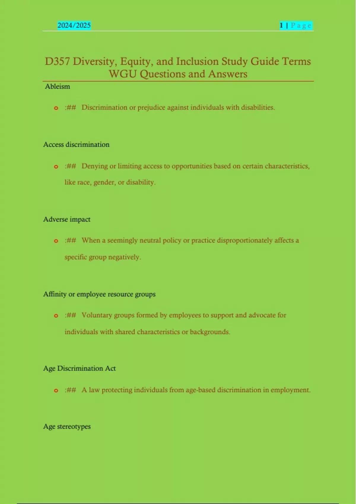 D357 Diversity, Equity, and Inclusion Study Guide Terms WGU Questions and Answers