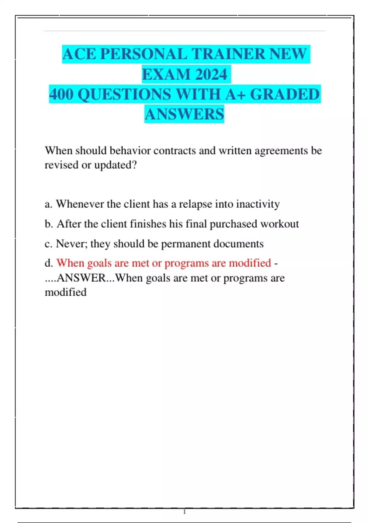 ACE PERSONAL TRAINER NEW EXAM 2024 400 QUESTIONS WITH A+ GRADED ANSWERS