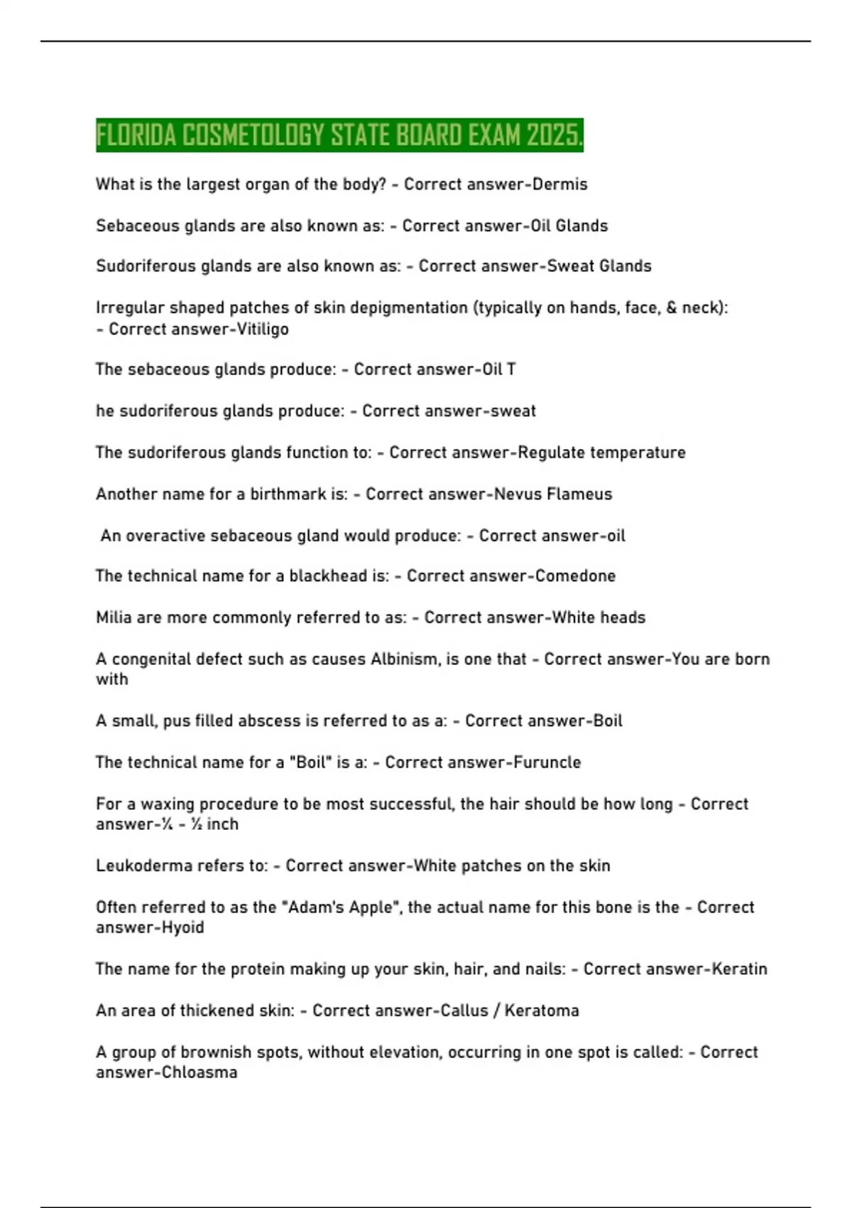 FLORIDA COSMETOLOGY STATE BOARD EXAM 2025. What is the largest organ of the body? - Correct answer-Dermis Sebaceous glands are also known as: - Correct answer-Oil Glands Sudoriferous glands are also known as: - Correct answer-Sweat Glands Irregular shaped patches of skin depigmentation (typically on hands, face, & neck): - Correct answer-Vitiligo The sebaceous glands produce: - Correct answer-Oil T he sudoriferous glands produce: - Correct answer-sweat The sudoriferous glands function to: - Correct answer-Regulate temperature Another name for a birthmark is: - Correct answer-Nevus Flameus An overactive sebaceous gland would produce: - Correct answer-oil The technical name for a blackhead is: - Correct answer-Comedone Milia are more commonly referred to as: - Correct answer-White heads A congenital defect such as causes Albinism, is one that - Correct answer-You are born with A small, pus filled abscess is referred to as a: - Correct answer-Boil The technical name for a "Boil" is a: - Correct answer-Furuncle For a waxing procedure to be most successful, the hair should be how long - Correct answer-¼ - ½ inch Leukoderma refers to: - Correct answer-White patches on the skin Often referred to as the "Adam's Apple", the actual name for this bone is the - Correct answer-Hyoid The name for the protein making up your skin, hair, and nails: - Correct answer-Keratin An area of thickened skin: - Correct answer-Callus / Keratoma A group of brownish spots, without elevation, occurring in one spot is called: - Correct answer-Chloasma Patchy brown skin discoloration, often the result of hormonal changes/pregnancy: Correct answer-Chloasma A swollen lesion usually lasting only a few hours, often caused by an insect bite: Correct answer-Wheal This is a contagious, pus filled abscess, generally caused by a bacterial infection: - Correct answer-Furuncle A comedone extractor would be used to treat: - Correct answer-Black-heads This is a temporary hair removal technique producing results similar to waxing: - Correct answer-Sugaring The only permanent hair removal technique: - Correct answer-Electrolysis What type of test should be conducted prior to any waxing or exfoliation procedure? - Correct answer-Predisposition test If the dermatologist says you have verrucas, you have: - Correct answer-Warts Pityriasis Capitis, can result from extreme changes in temperature, as a contact reaction to certain skin and hair care products, or, as an allergic reaction to certain foods; it can be oily or dry - and is commonly known as: - Correct answer-Dandruff Dandruff, can result from extreme changes in temperature, as a contact reaction to certain skin and hair care products, or, as an allergic reaction to certain foods; it can be oily or dry - and goes by the Latin / medical name of: - Correct answer-Pityriasis Capitis The epidermis is the: - Correct answer-Top or outermost layer of the skin The study of the microscopic anatomy of plant and animal cells, including their structure and function is known as: - Correct answer-Histology Responsible for maintaining the bodies internal temperature: - Correct answer Sudoriferous Glands The Integumentary System refers to: - Correct answer-The skin, its appendages, and accessory organs Serve to waterproof, cushion, excrete waste, and regulate the body's temperature: Correct answer-The sebaceous & sudoriferous glands Exfoliating creams usually have a pH in what range? – Correct answer-Alkaline The pH range of human skin is between - Correct answer-4.5 - 5.5 All exfoliation techniques (manual, mechanical, chemical) do essentially the same thing Correct answer-Remove skin tissue