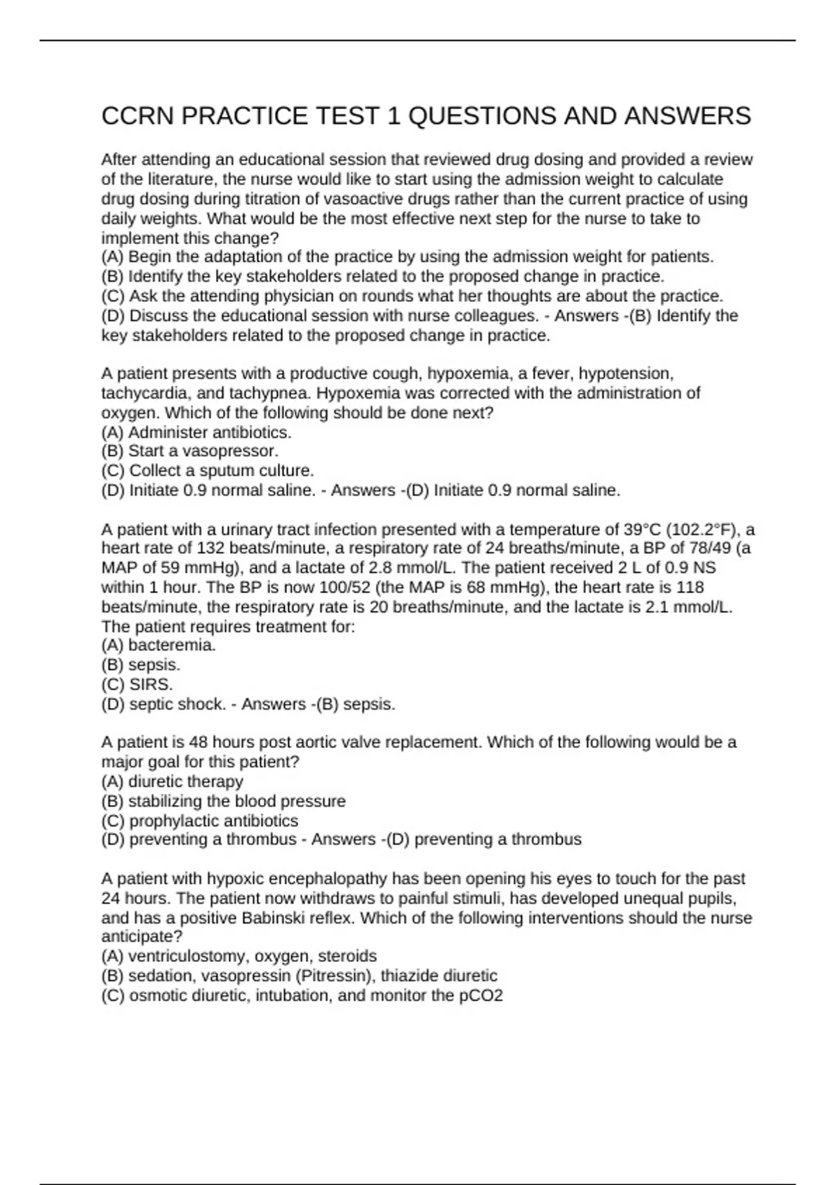 CCRN PRACTICE TEST 1 QUESTIONS AND ANSWERS