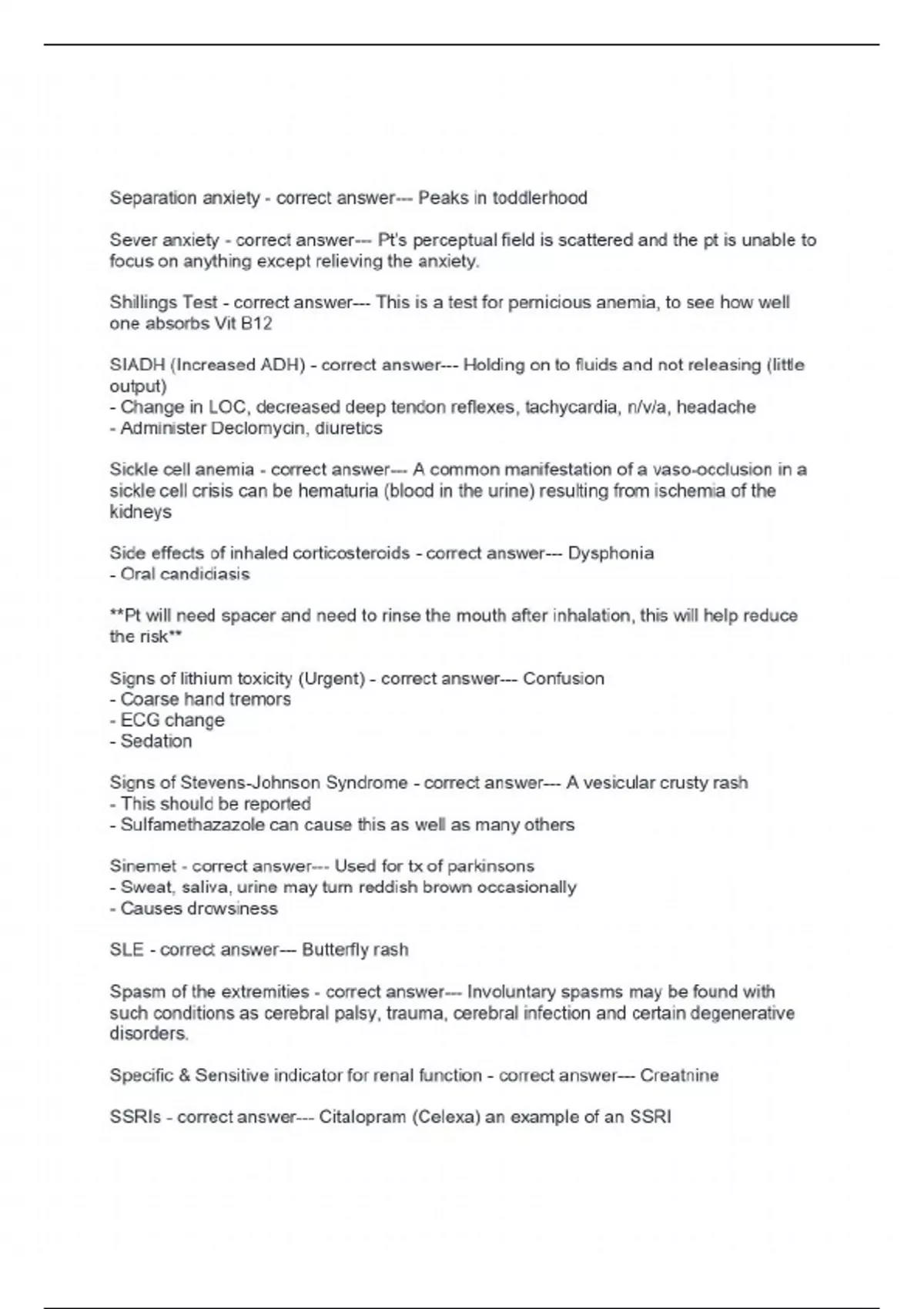 Latest ATI RN Predictor Study Questions And Answers A 12 month old infant recently had a fever, runny nose, cough and white spots in the mouth for 3 days. A rash developed that started on the face and spread to the whole body. What should you suspect that the child has? - correct answer--- Rubeola (Measles) A big cue with lithium toxicity is what? - correct answer--- If a pt complains of metallic taste in mouth. Abruptio placentae - correct answer--- Persistent uterine contractions - Painful - Placenta separates from the uterus - Bleeding inside the uterus - Life-threatening to the fetus Ace Inhibitors - correct answer--- Watch for dry cough (discontinue and report) - Hypotension - Increased K+ levels (can cause hyperkalemia) - Common meds: Captopril, Enalapril (Ends in "pril") Acetazolamide - correct answer--- This is a med used for open angle glaucoma - Adverse effect of this med is tingling of fingers and hyperglycemia Active TB treatment duration? - correct answer--- Active TB is usually treated with the simultaneous administration of a combo of meds to which the organisms are susceptible. Such therapy is continued until the disease is controlled. A 6-9 month regimen consisting of two meds is frequently used. Acupressure band - correct answer--- These bands can be worn on the wrists and can help alleviate nausea and vomiting. - An alternative therapy option for pregnancy n/v. Acute phase of Kawasakis - correct answer--- Beginning stage - Starts with high fever uncontrolled by antipyretics - Tachycardia - Irritability - Strawberry tongue - Conjunctival redness Addison's Disease - correct answer--- Is an endocrine disorder that occurs when the adrenal glands do not produce enough of the hormone cortisol and in some cases, the hormone aldosterone. - The disease is characterized by weight loss, muscle weakness, fatigue, low BP and hyperpigmentation (darkening) of the skin in both exposed and non-exposed parts of the body. Addison's Disease Treatment: - correct answer--- High protein, high carb diet - Weigh daily - Injectable IV fast acting steroid may be ordered or indicated for a pt experiencing an Addisonian crisis until the pt is no longer at risk for dehydration, hypotension and shock. Addisons Disease - correct answer--- Think of ADD as needs to add hormones Adverse effects of glucocorticoids are? - correct answer--- Osteoporosis, which needs to be monitored regularly w/bone density scans After a shunt placement, what is the bed position? - correct answer--- Flat (so fluid doesn't reduce too rapidly) - If you see signs of increasing ICP, then raise the HOB to 15-30 degrees. After cataract surgery - correct answer--- Pt will sleep on UNAFFECTED side with a night shield for 1-4 weeks Agoraphobia - correct answer--- Fear of being in places in which help may not be available Agranulocytosis - correct answer--Is a rare adverse reaction to Clozapine (Clozaril) in which WBC's drop causing pt to become susceptible to acute infections. Air/Pulmonary Embolism - correct answer--S/S: Chest pain, difficulty breathing, tachycardia, pale/cyanotic, sense of impending doom, bloody sputum Tx: Heaprin, d-dimer lab, O2 Airborne Precaution - correct answer--**Think MTV** M= Measles T= TB V= Varicella-Chicken pox/herpes Zoster-Shingles Akathisia - correct answer--- Motor restlessness, person needs to keep going - Tx with antiparkinsons meds - Can be mistaken for agitation Albuterol - correct answer--- Used for acute asthma attacks