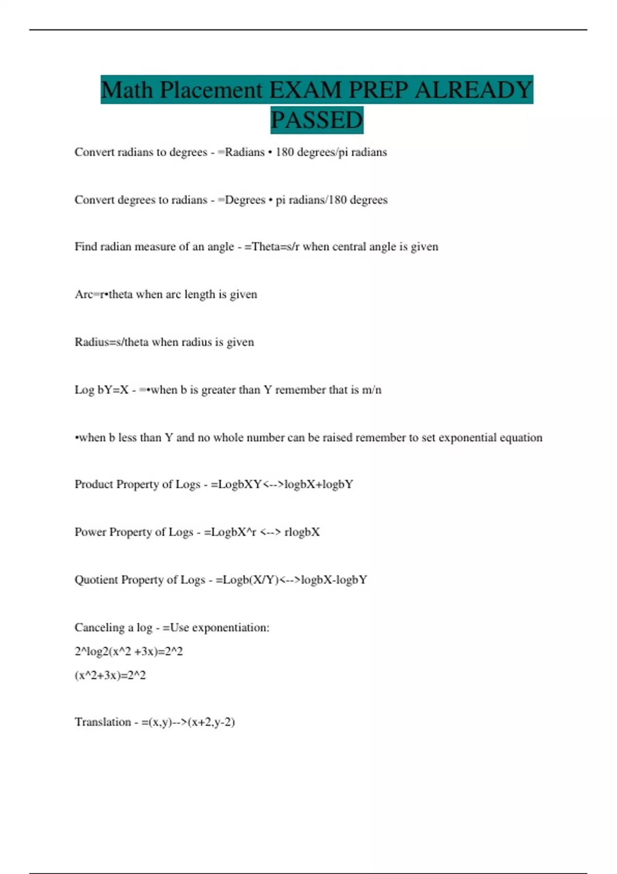 Math Placement EXAM PREP ALREADY