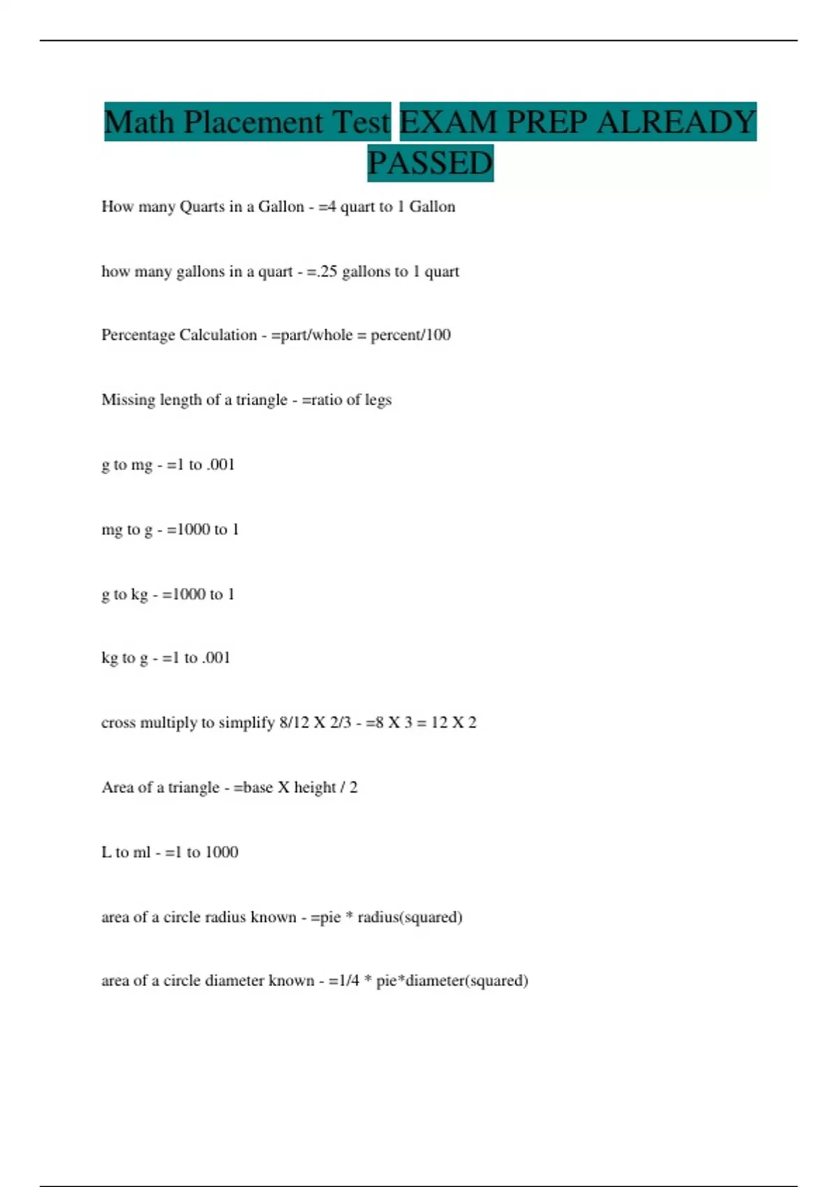 Math Placement Test EXAM PREP ALREADY PASSED