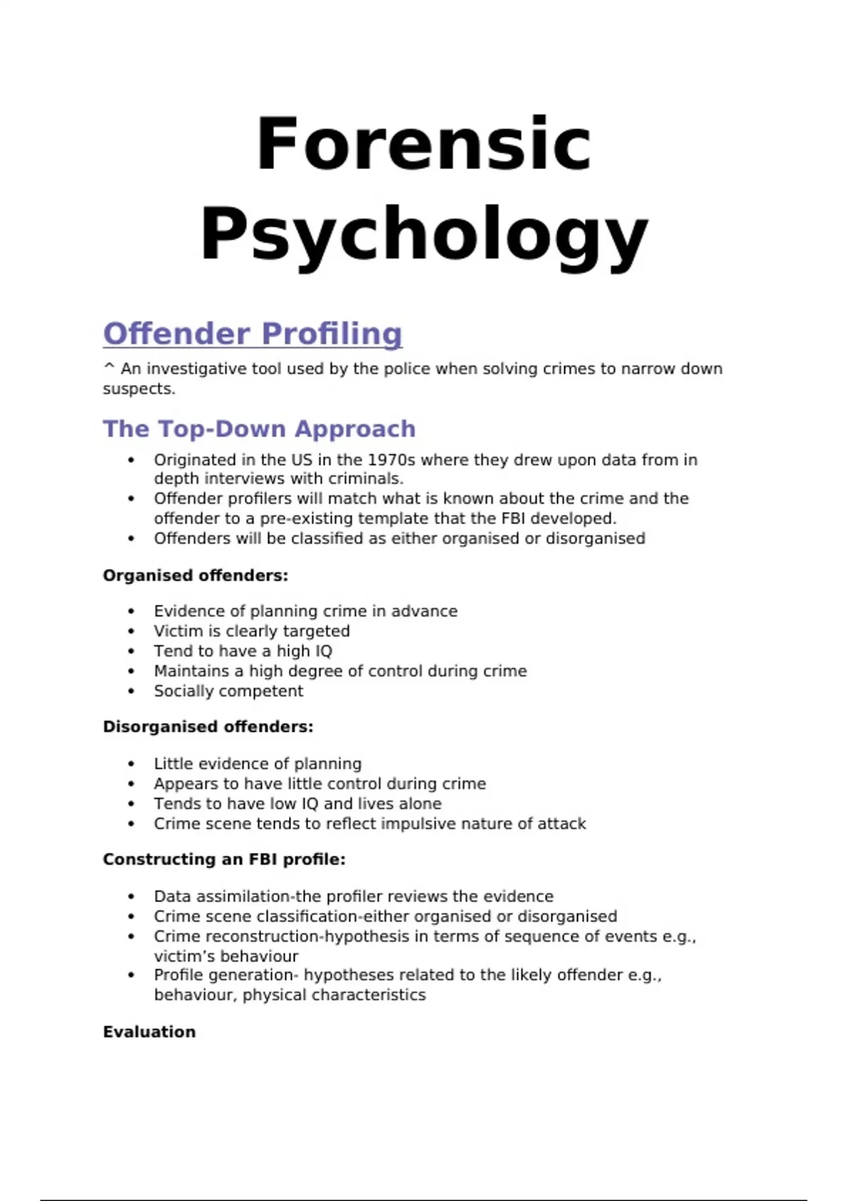 These are summarised revision notes for a AQA forensic psychology in paper 3 including 3 to 4 evaluation points with counter arguments. Memorising these notes scored me an A in my papers