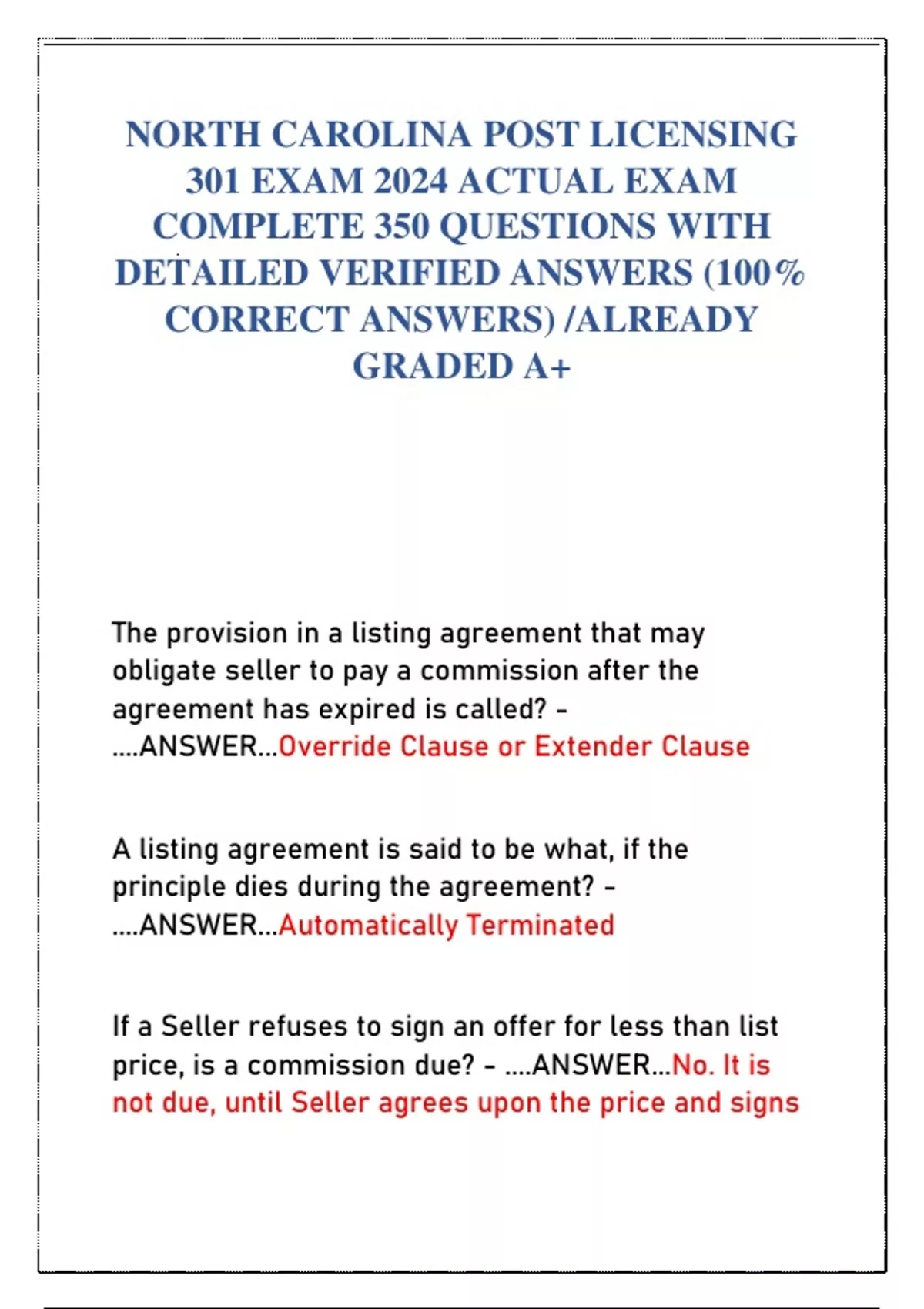 NORTH CAROLINA POST LICENSING 301 EXAM 2024 ACTUAL EXAM COMPLETE 350 QUESTIONS WITH DETAILED VERIFIED ANSWERS (100% CORRECT ANSWERS) /ALREADY GRADED A+