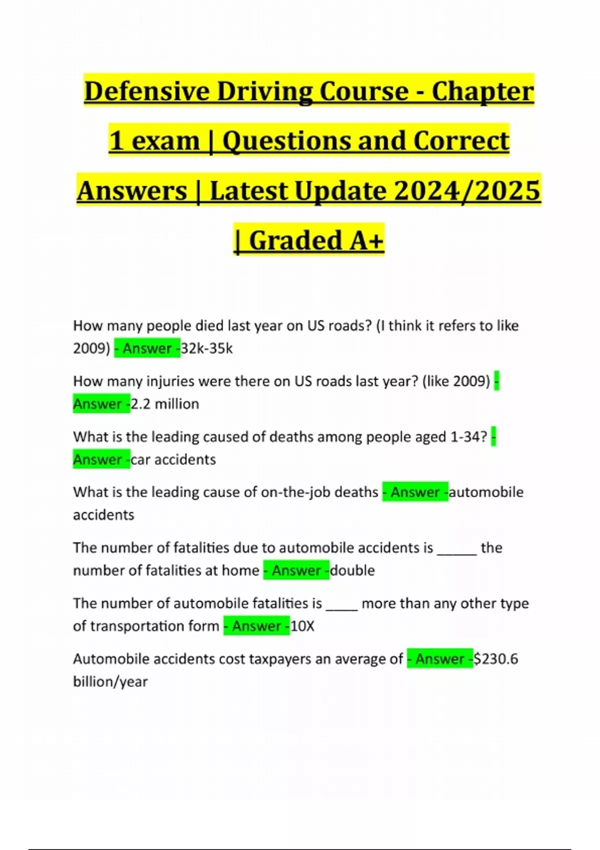 Defensive Driving Course - Chapter 1 exam | Questions and Correct Answers | Latest Update 2024/2025 | Graded A+ How many people died last year on US roads? (I think it refers to like 2009) - Answer -32k-35k How many injuries were there on US roads last year? (like 2009) - Answer -2.2 million What is the leading caused of deaths among people aged 1-34? - Answer -car accidents What is the leading cause of on-the-job deaths - An