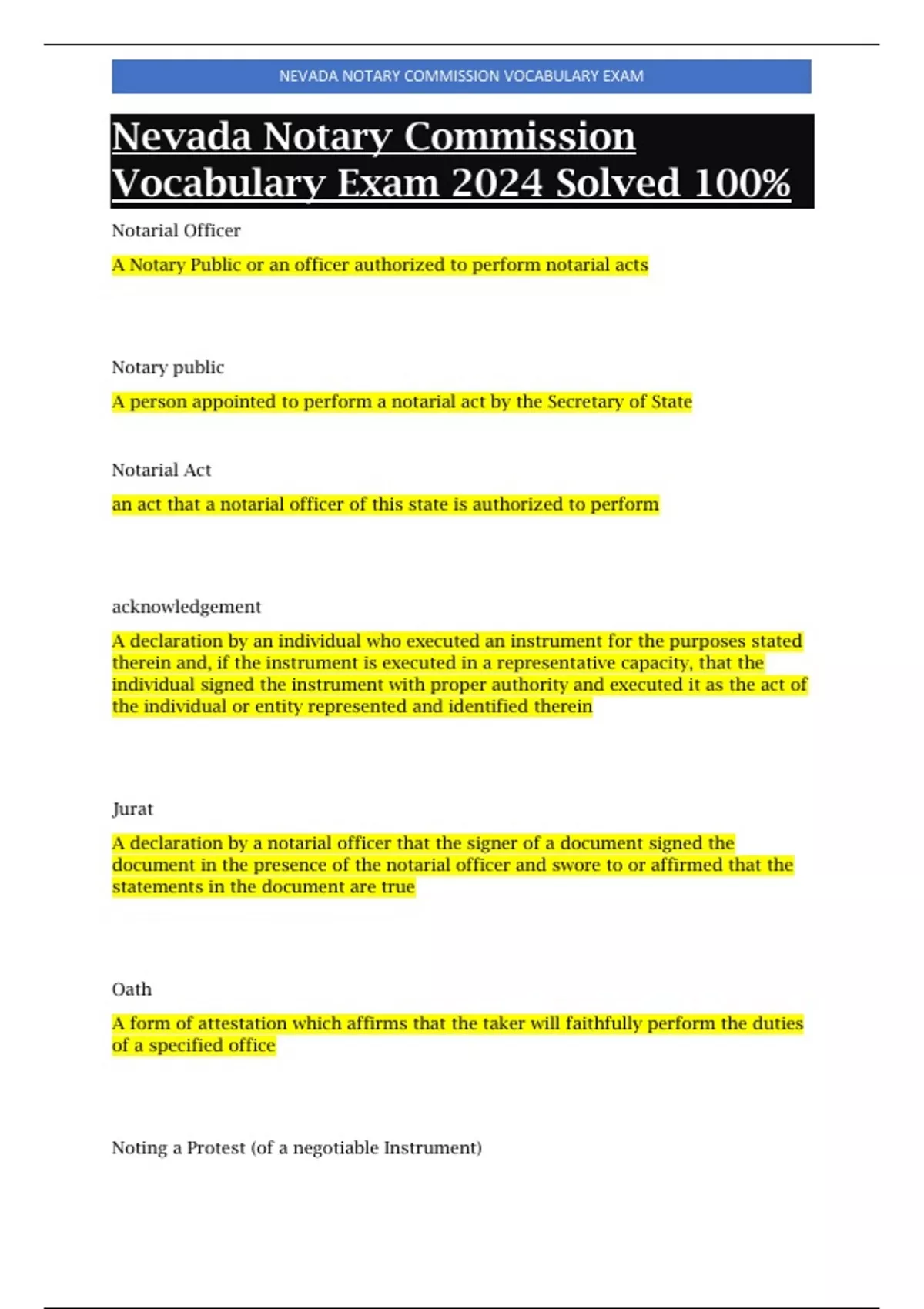 , NEVADA NOTARY COMMISSION VOCABULARY EXAM