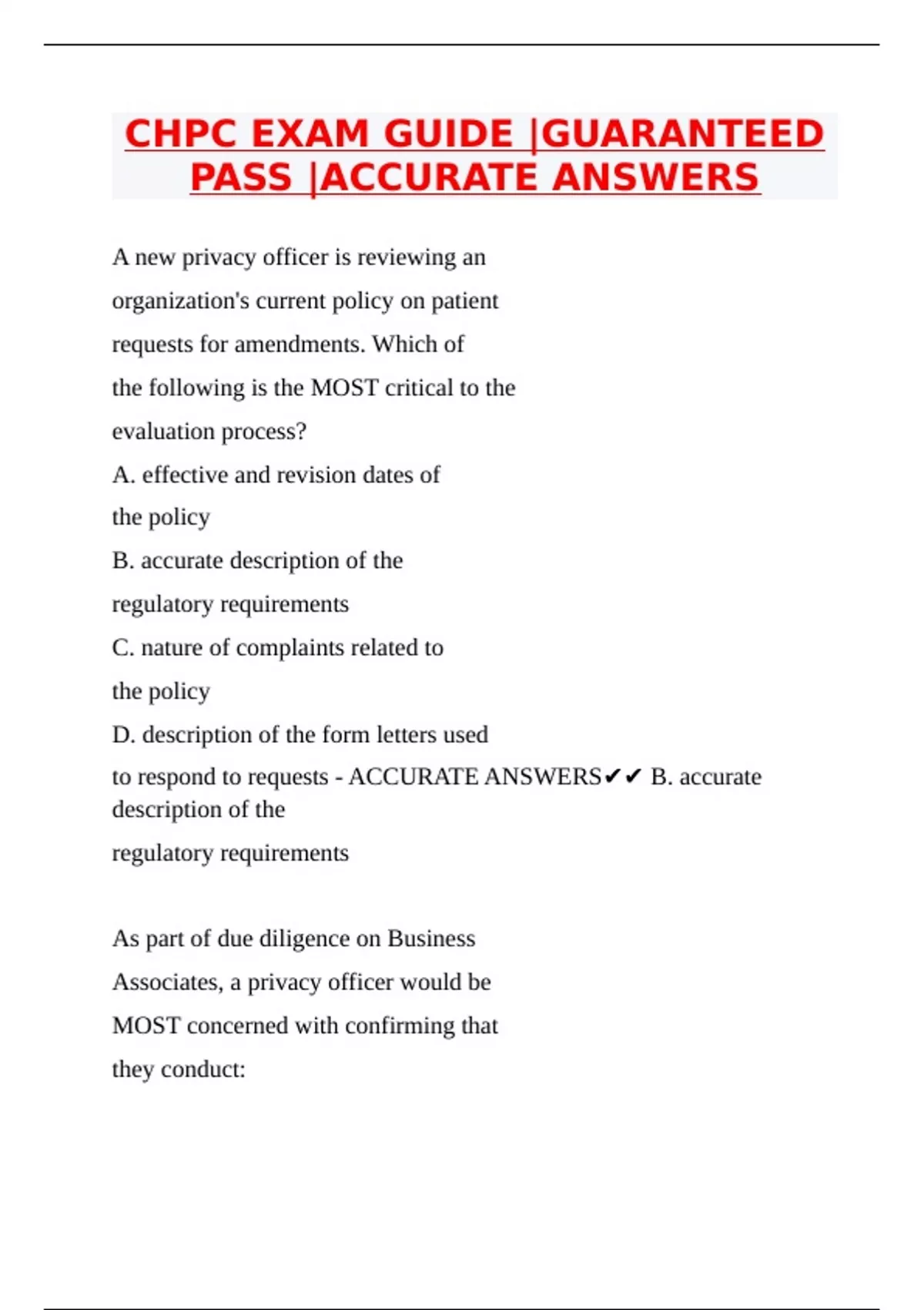 A new privacy officer is reviewing an organization's current policy on patient requests for amendments. Which of the following is the MOST critical to the evaluation process? A. effective and revision dates of the policy B. accurate description of the regulatory requirements C. nature of complaints related to the policy D. description of the form letters used to respond to requests - ACCURATE ANSWERS B. accurate description of the regulatory requirements As part of due diligence on Business Associates, a privacy officer would be MOST concerned with confirming that they conduct: A. criminal background checks. B. credit history checks. C. provider credentialing checks. D. health screening checks. - ACCURATE ANSWERS A. criminal background checks. Data breach response training is required by which of the following regulations? A. HITECH B. GLBA C. FMLA D. Privacy Act - ACCURATE ANSWERS A. HITECH A business associate has contacted an organization's privacy officer to alert him that some of the patient information that they hold in relation to the BAA may have been breached. An employee took a laptop that contained patient information from several vendors and misplaced it at an airport. The