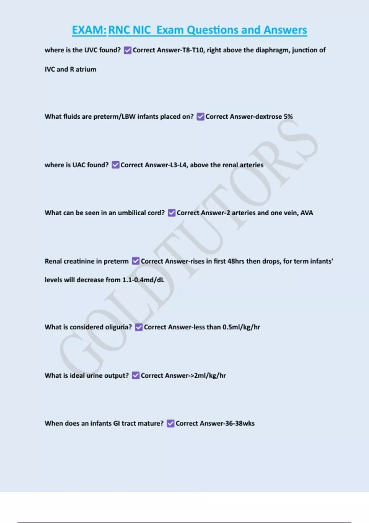 EXAM:RNC NIC Exam Questions and Answers where is the UVC found? Correct Answer-T8-T10, right above the diaphragm, junction of IVC and R atrium What fluids are preterm/LBW infants placed on? Correct Answer-dextrose 5% where is UAC found? Correct Answer-L3-L4, above the renal arteries