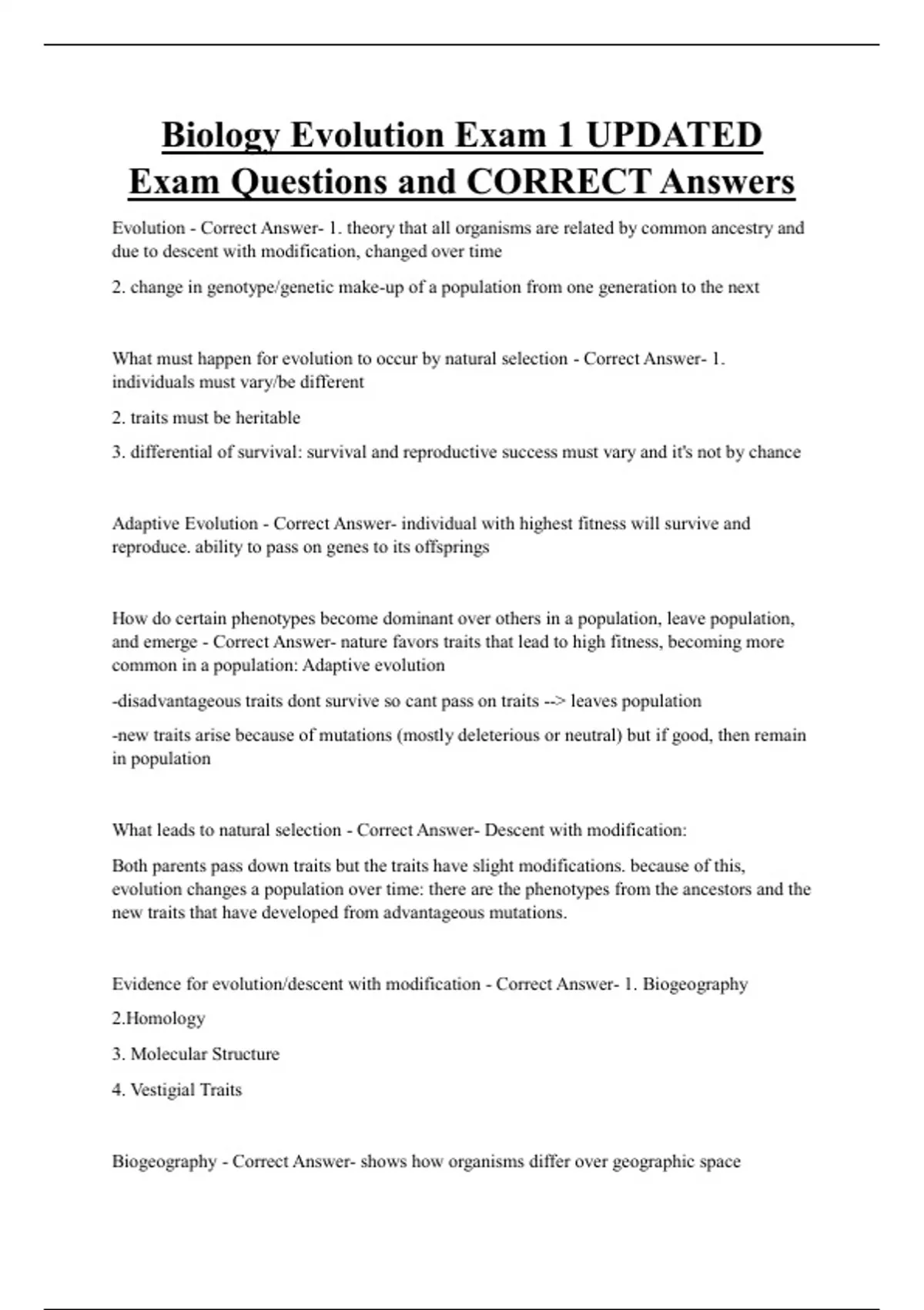 Biology Evolution Exam 1 UPDATED Exam Questions and CORRECT Answers Evolution - Correct Answer- 1. theory that all organisms are related by common ancestry and due to descent with modification, changed over time 2. change in genotype/genetic make-up of a population from one generation to the next What must happen for evolution to occur by natural selection - Correct Answer- 1. individuals must vary/be different 2. traits must be heritable 3. differential of survival: survival and reproductive success must vary and it's not by chance