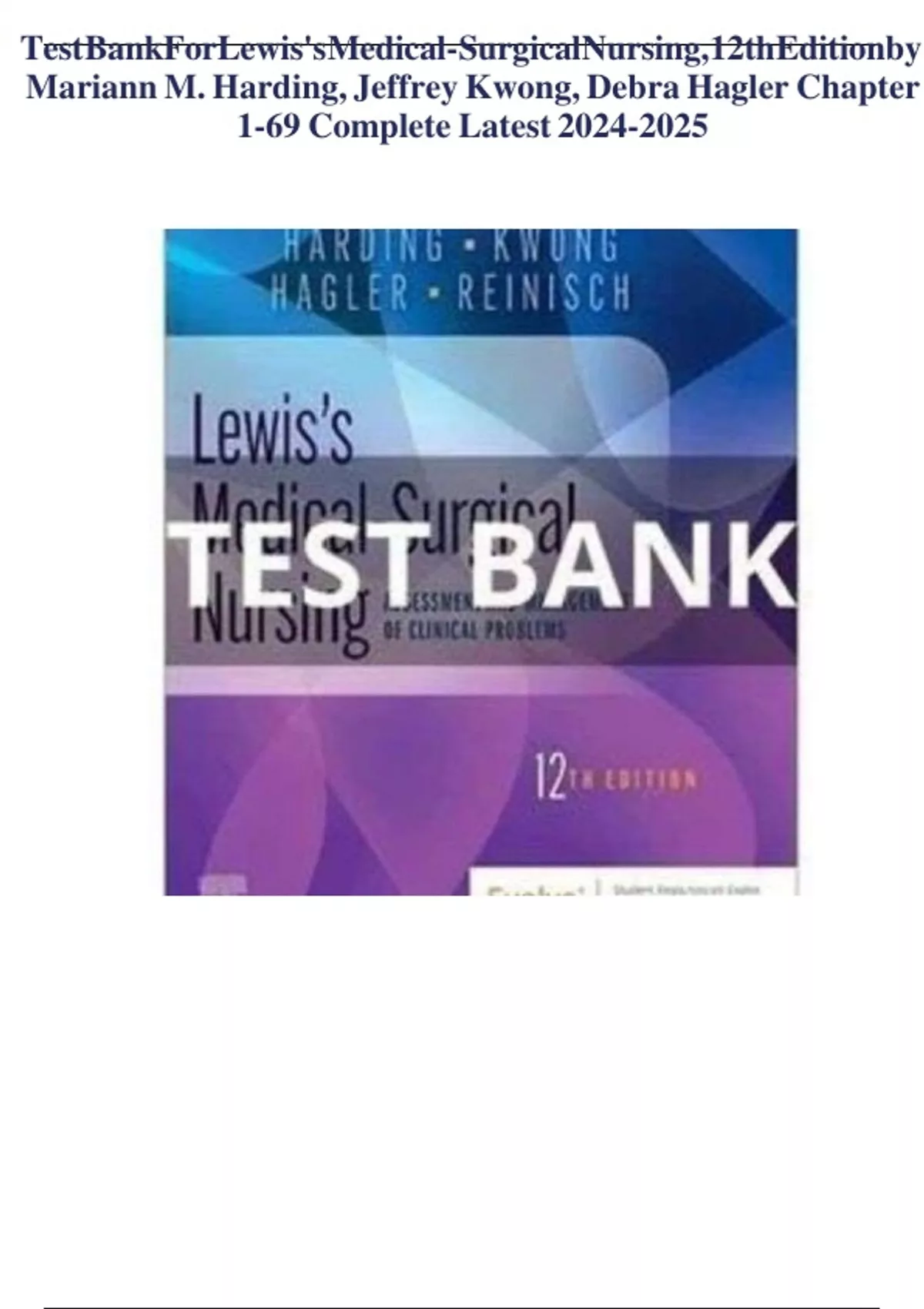 TEST BANK FOR LEWIS MEDICAL SURGICAL NURSING 12TH EDITION BY BY MARIANN M. HARDING, JEFFREY KWONG, DEBRA HAGLER, AND COURTNEY REINISCH/UPDATED VERSION 2023/2024/ ALL CHAPTERS COVERED(CHAPTER 1 TO CHAPTER 69)/100% CORRECT ANSWERS WITH RATIONALE/GRADED A+/P