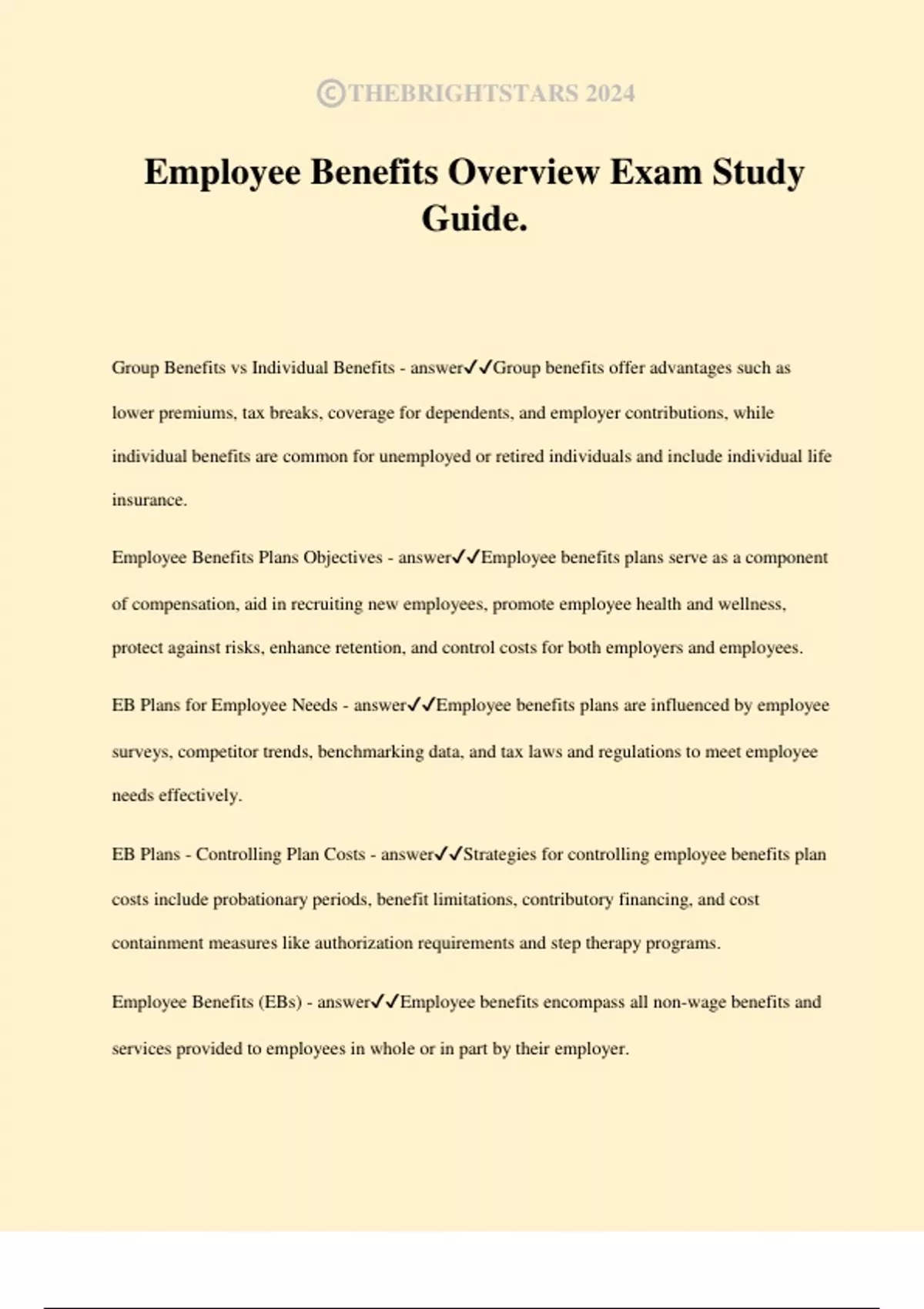 Employee Benefits Overview Exam Study Guide. Group Benefits vs Individual Benefits - answerGroup benefits offer advantages such as lower premiums, tax breaks, coverage for dependents, and employer contributions, while individual benefits are common for unemployed or retired individuals and include individual life insurance. Employee Benefits Plans Objectives - answerEmployee benefits plans serve as a component of compensation, aid in recruiting new employees, promote employee health and wellness, protect against risks, enhance retention, and control costs for both employers and employees. EB Plans for Employee Needs - answerEmp