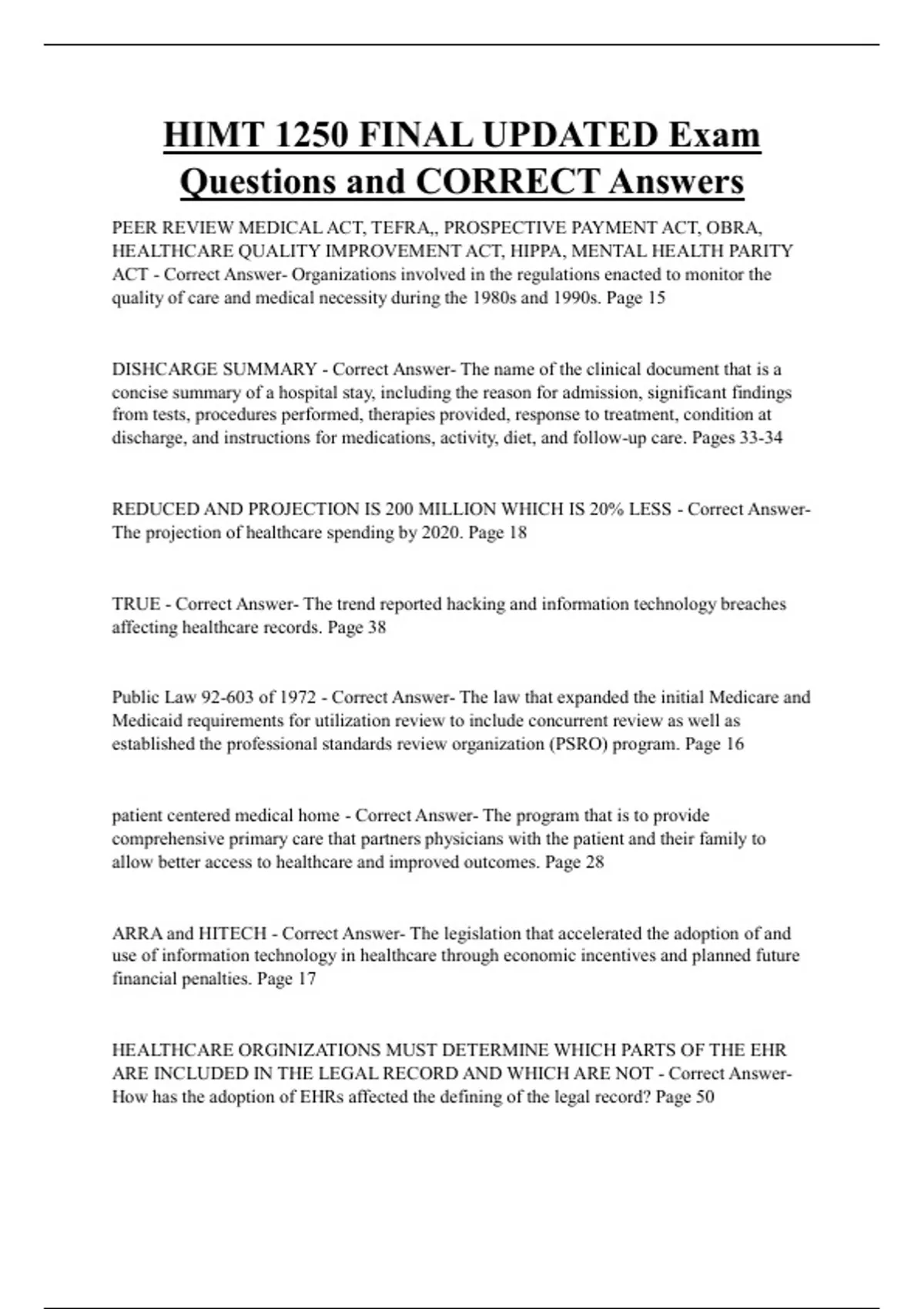 HIMT 1250 FINAL UPDATED Exam Questions and CORRECT Answers PEER REVIEW MEDICAL ACT, TEFRA,, PROSPECTIVE PAYMENT ACT, OBRA, HEALTHCARE QUALITY IMPROVEMENT ACT, HIPPA, MENTAL HEALTH PARITY ACT - Correct Answer- Organizations involved in the regulations enacted to monitor the quality of care and medical necessity during the 1980s and 1990s. Page 15