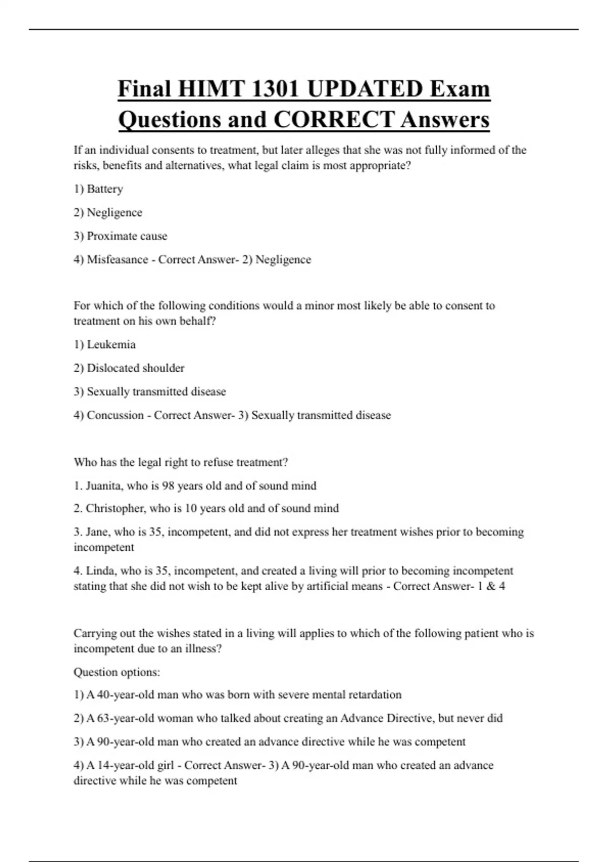 Final HIMT 1301 UPDATED Exam Questions and CORRECT Answers If an individual consents to treatment, but later alleges that she was not fully informed of the risks, benefits and alternatives, what legal claim is most appropriate? 1) Battery 2) Negligence 3) Proximate cause 4) Misfeasance - Correct Answer- 2) Negligence