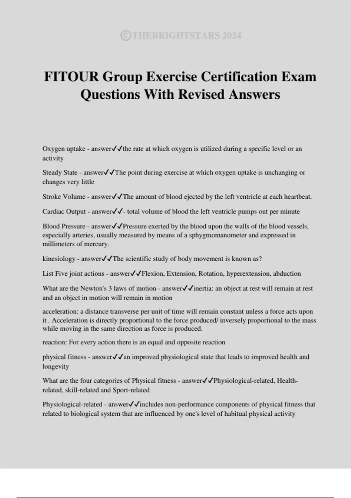 FITOUR Group Exercise Certification Exam Questions With Revised Answers Oxygen uptake - answerthe rate at which oxygen is utilized during a specific level or an activity Steady State - answerThe point during exercise at which oxygen uptake is unchanging or changes very little Stroke Volume - answerThe amount of blood ejected by the left ventricle at each heartbeat. Cardiac Output - answer- total volume of blood the left ventricle pumps out per minute Blood Pressure - answerPressure exerted by the blood upon the walls of the blood vessels, especially arteries, usually measured by means of a sphygmomanometer and expressed in millimeters of mercury. kinesiology - answerThe scientific study of body movement is known as? List Five joint actions - answerFlexion, Extension, Rotation, hyperextension, abduction What are the Newton's 3 laws of motion - answerinertia: an object at rest will remain at rest and an object in motion will remain in motion acceleration: a distance transverse per unit of time will remain constant unless a force acts upon it . Acceleration is directly proportional to the force produced/ inversely proportional to the mass while moving in the same direction as force is produced. reaction: For every action there is an equal and opposite reaction physical fitness - answeran improved physiological state that leads to improved health and longevity What are the four categories of Physical fitness - answerPhysiological-related, Health- related, skill-related and Sport-related Physiological-related - answerincludes non-performance components of physical fitness that related to biological system that are influe