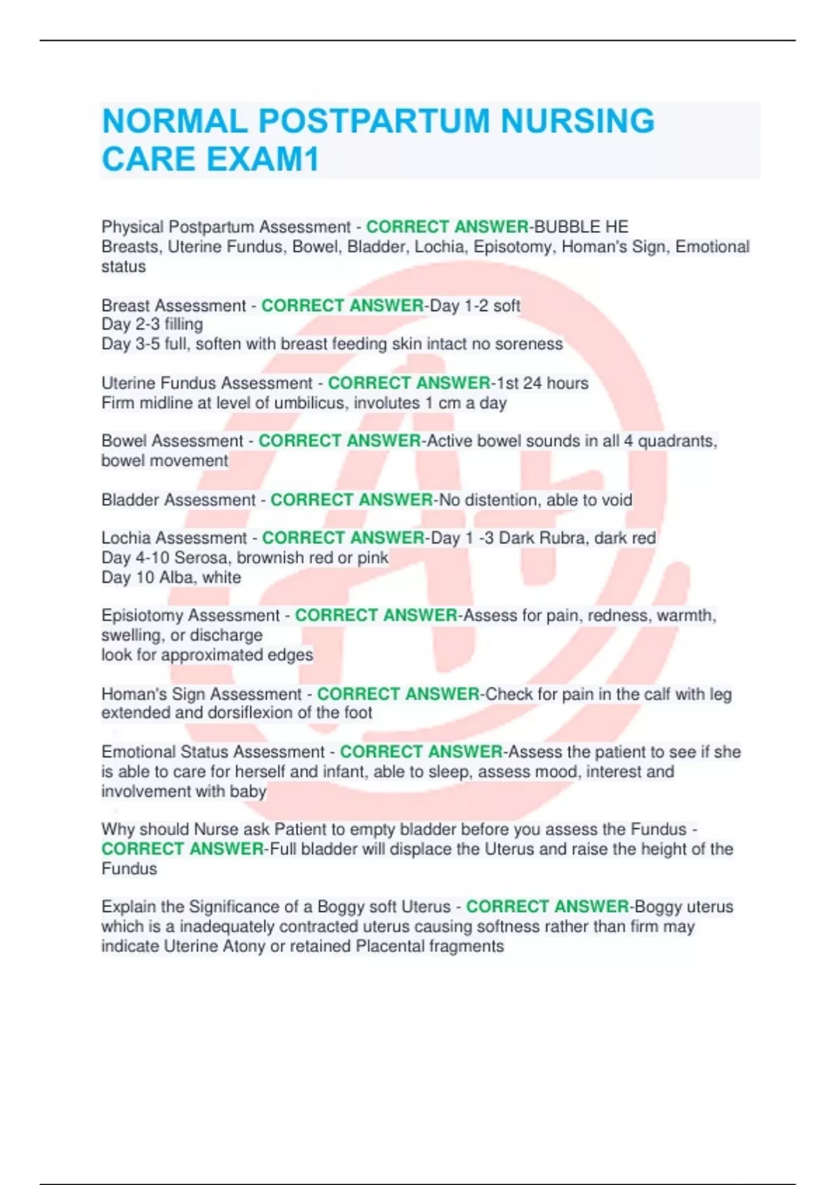 Physical Postpartum Assessment - CORRECT ANSWER-BUBBLE HE