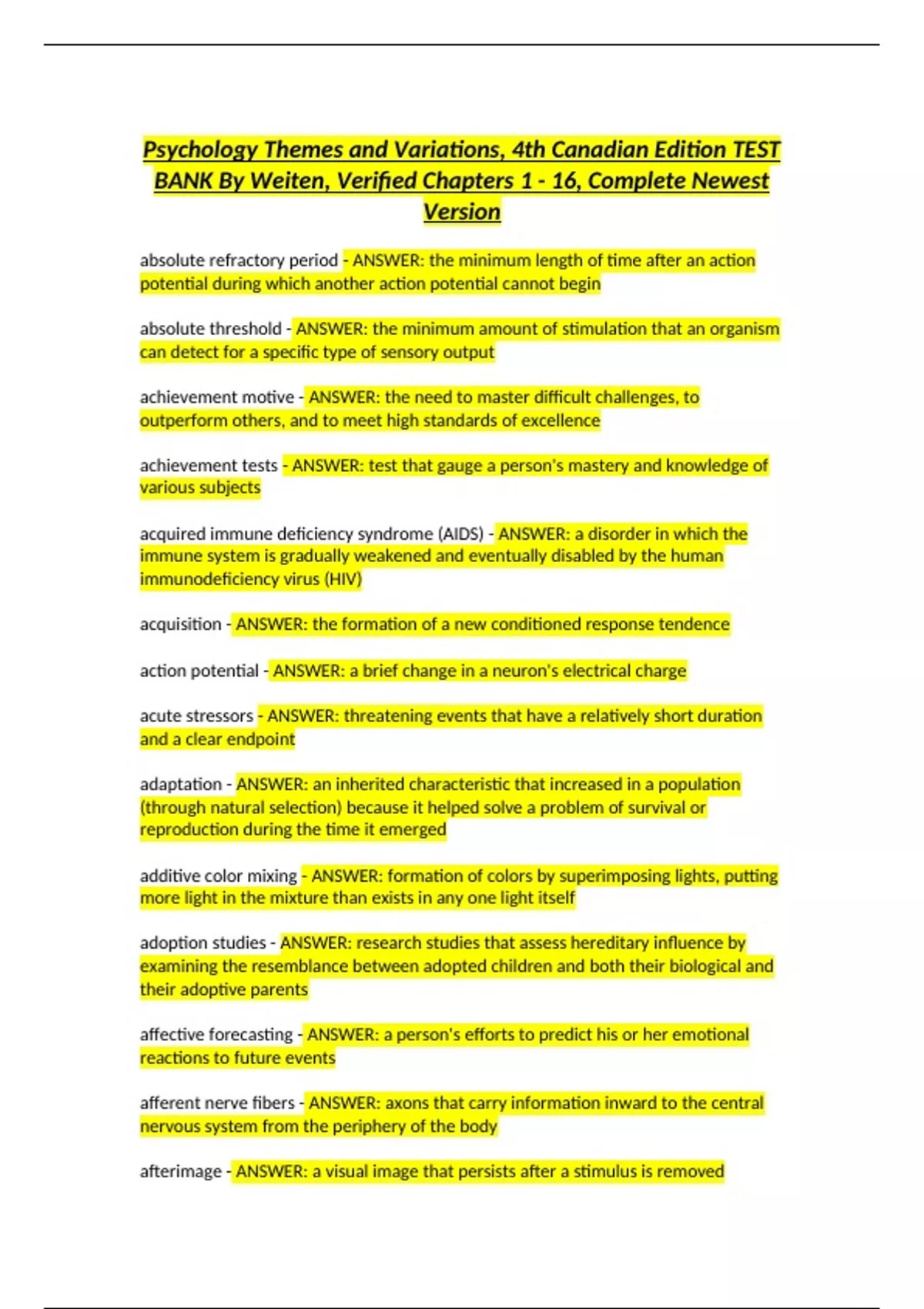 Psychology Themes and Variations, 4th Canadian Edition TEST BANK By Weiten, Verified Chapters 1 - 16, Complete Newest Version