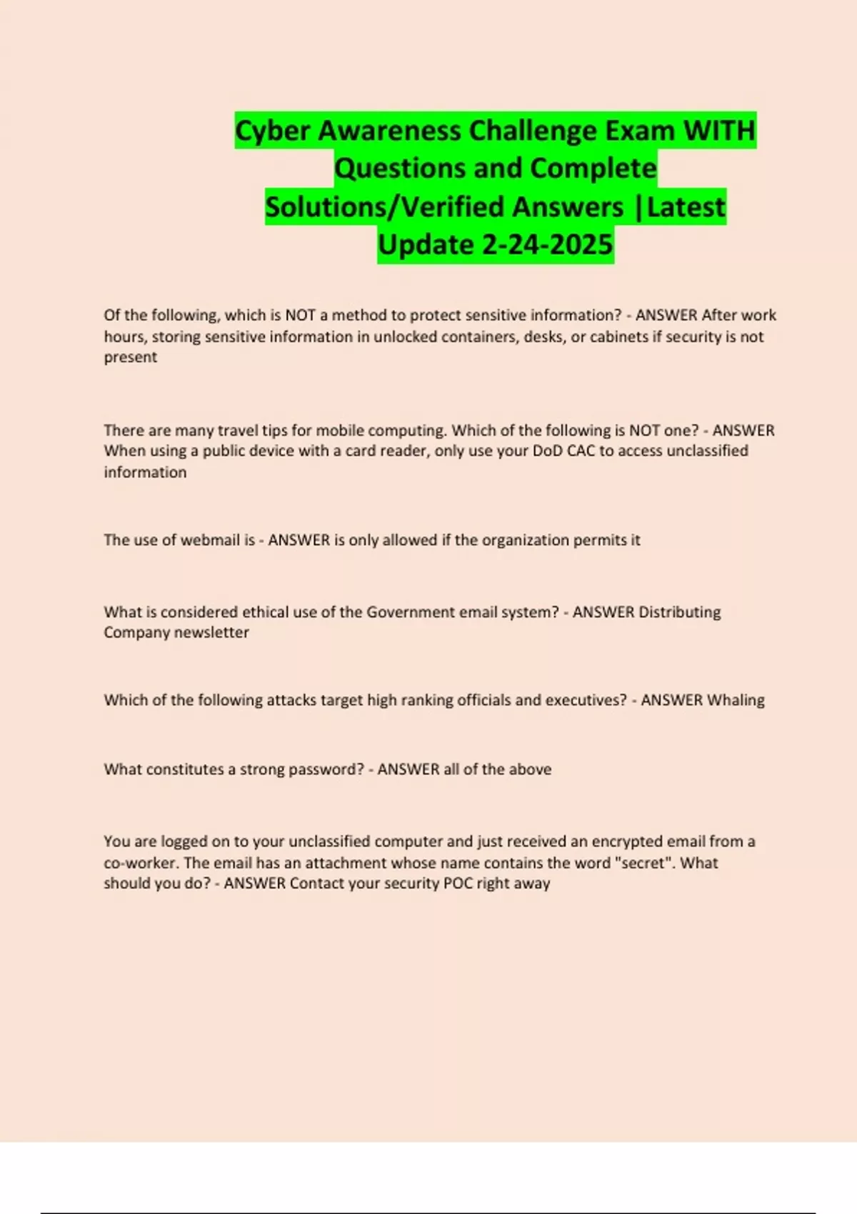 Cyber Awareness Challenge Exam WITH Questions and Complete Solutions/Verified Answers |Latest Update 2-24-2025