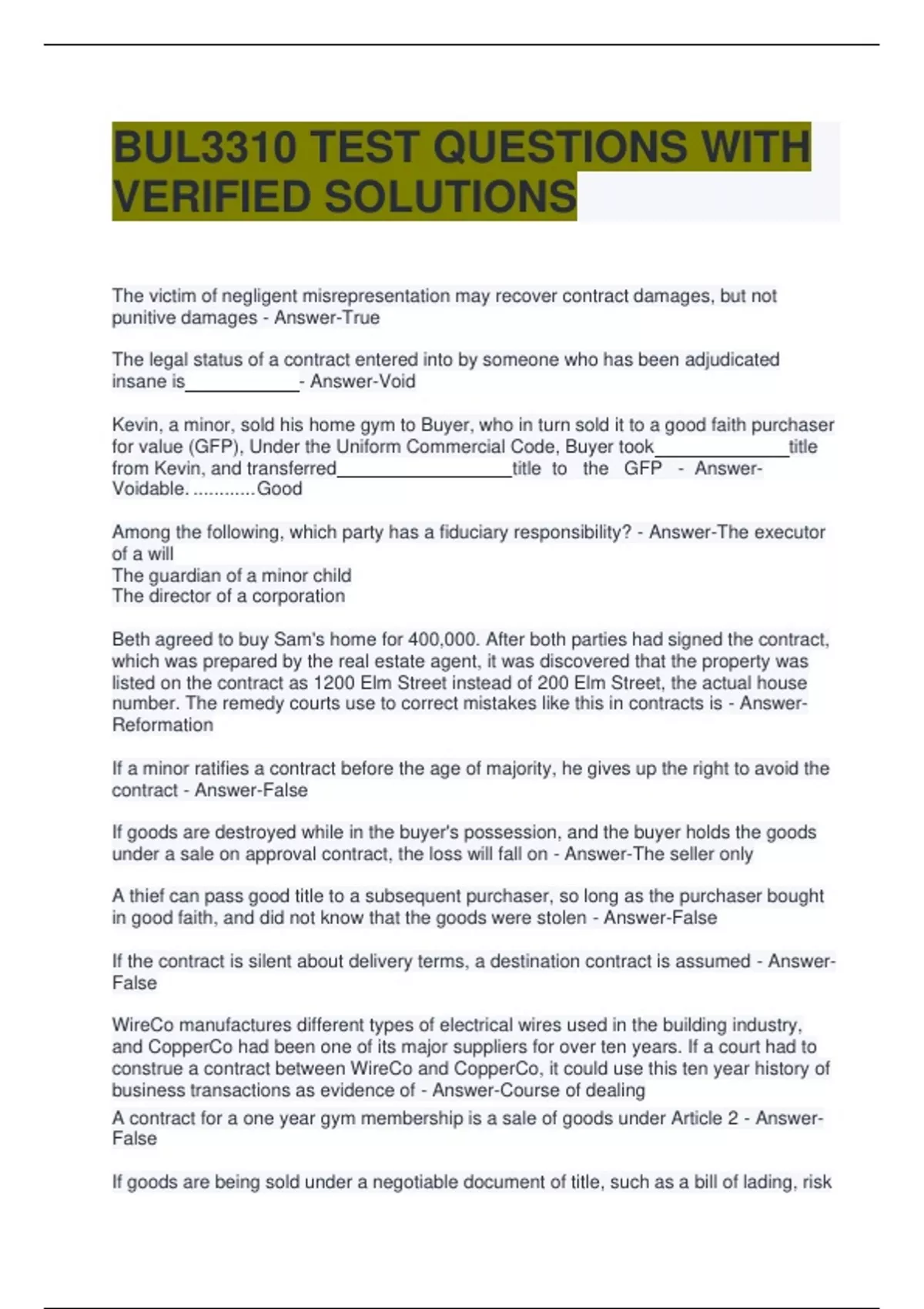 BUL3310 TEST QUESTIONS WITH VERIFIED SOLUTIONS The victim of negligent misrepresentation may recover contract damages, but not punitive damages - Answer-True The legal status of a contract entered into by someone who has been adjudicated insane is - Answer-Void Kevin, a minor, sold his home gym to Buyer, who in turn sold it to a good faith purchaser for value (GFP), Under the Uniform Commercial Code, Buyer took title from Kevin, and transferred title to the GFP - Answer- Voidable. Good Among the following, which party has a fiduciary responsibility? - Answer-The executor of a will The guardian of a minor child The director of a corporation Beth agreed to buy Sam's home for 400,000. After both parties had signed the contract, which was prepared by the real estate agent, it was discovered that the property was listed on the contract as 1200 Elm Street instead of 200 Elm Street, the actual house number. The remedy courts use to correct mistakes like this in contracts is - Answer- Reformation If a minor ratifies a contract before the age of majority, he gives up the right to avoid the contract - Answer-False If goods are destroyed while in the buyer's possession, and the buyer holds the goods under a sale on approval contract, the loss will fall on - Answer-The seller only A thief can pass good title to a subsequent purchaser, so long as the purchaser bought in good faith, and did not know that the goods were stolen - Answer-False If the contract is silent about delivery terms, a destination contract is assumed - Answer- False WireCo manufactures different types of electrical wires used in the building industry, and CopperCo had been one of its major suppliers for over ten years. If a court had to construe a contract between WireCo and CopperCo, it could use this ten year history of business transactions as evidence of - Answer-Course of dealing A contract for a one year gym membership is a sale of goods under Article 2 - Answer- False
