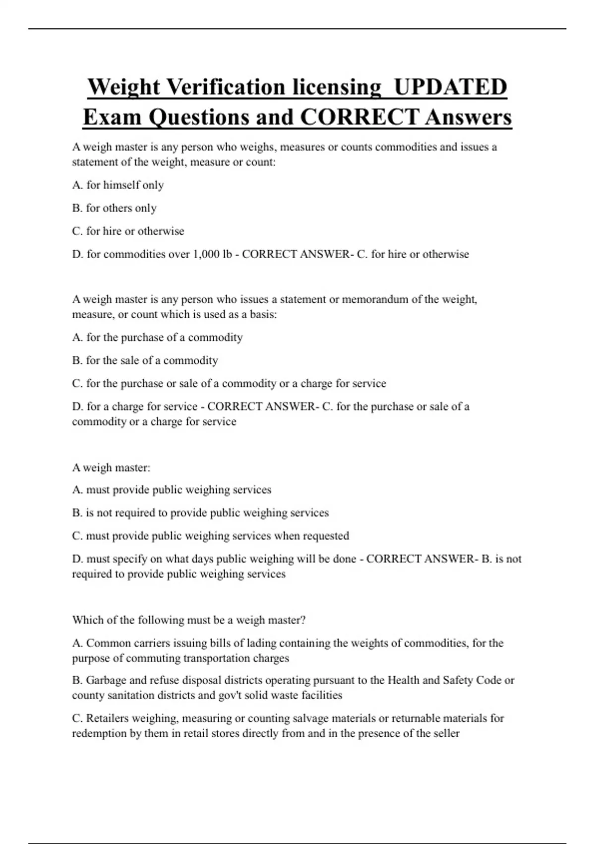 Weight Verification licensing UPDATED Exam Questions and CORRECT Answers A weigh master is any person who weighs, measures or counts commodities and issues a statement of the weight, measure or count: A. for himself only B. for others only C. for hire or otherwise D. for commodities over 1,000 lb - CORRECT ANSWER- C. for hire or otherwise