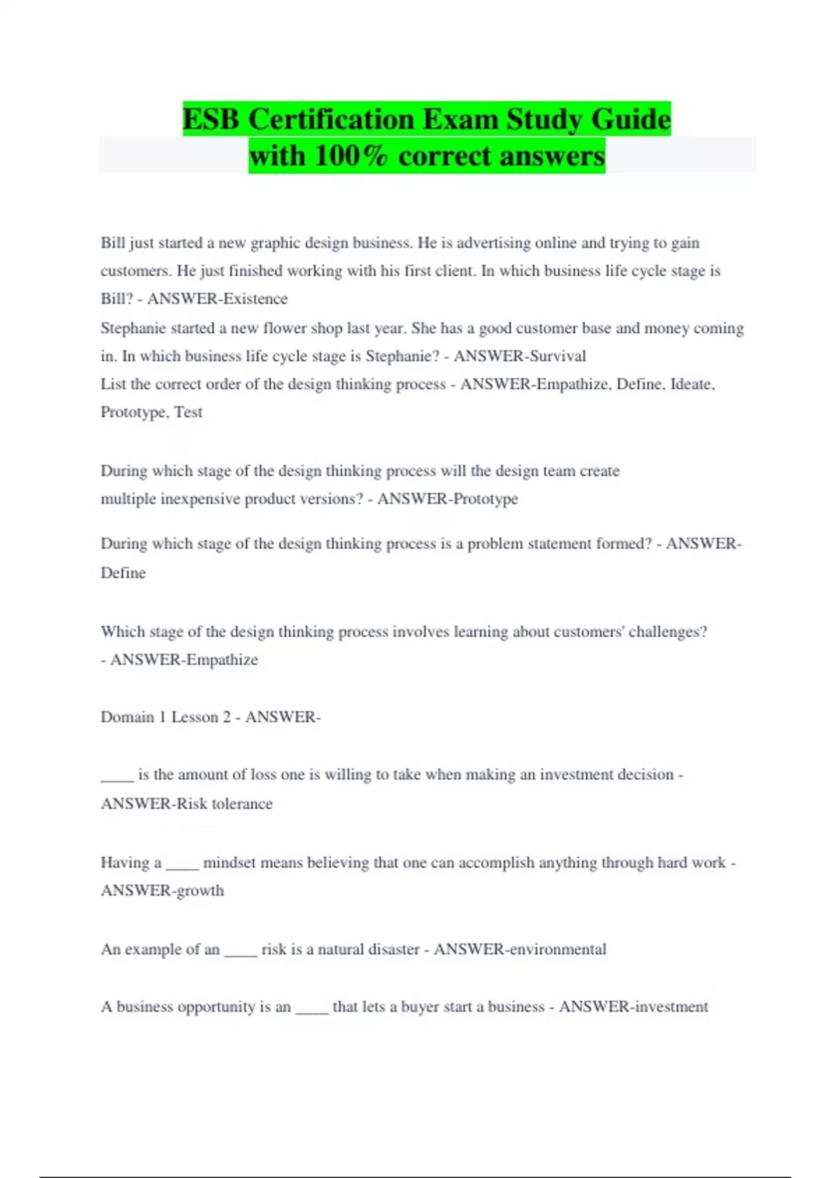 ESB Certification Exam Study Guide with 100% correct answers