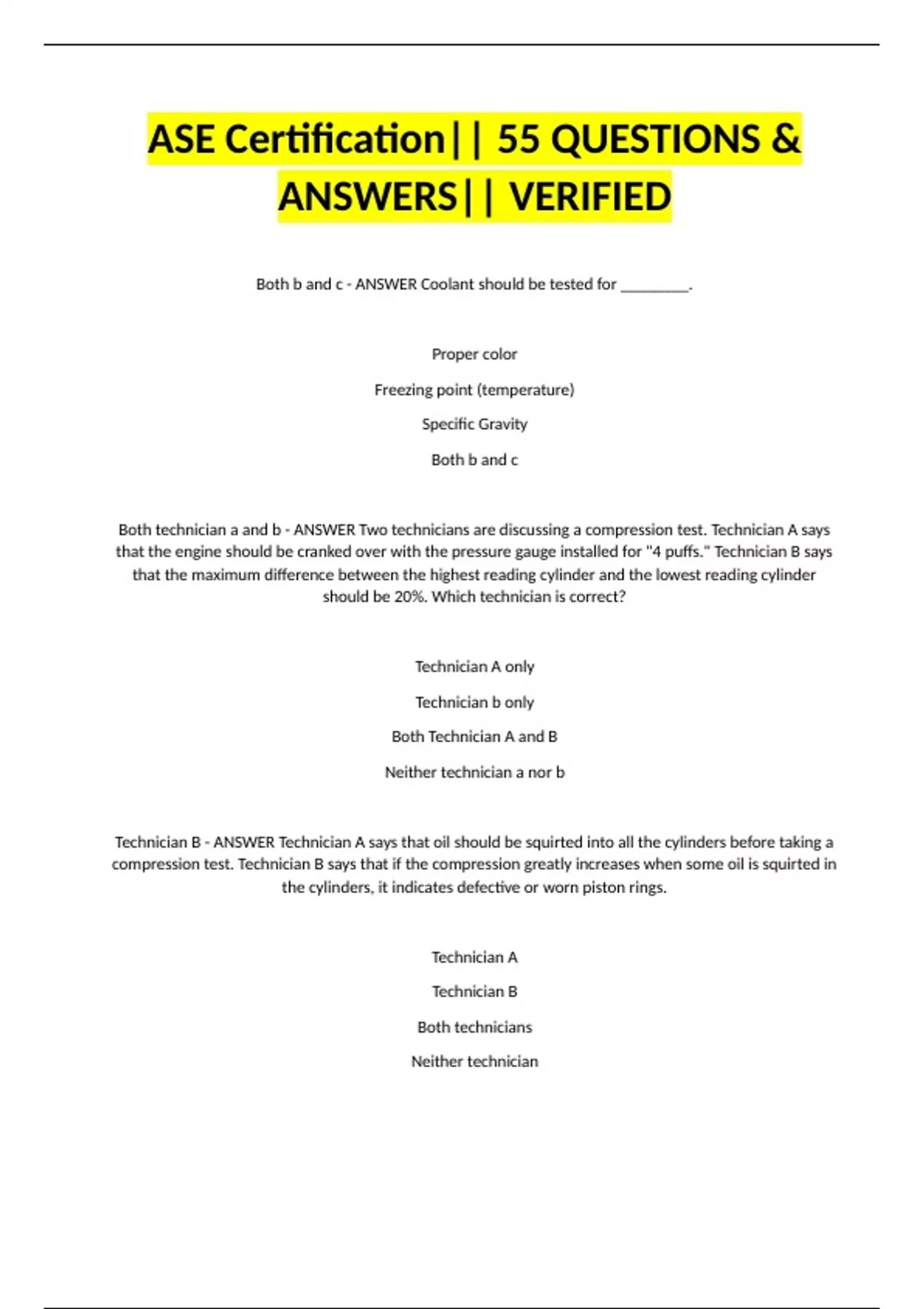 ASE Certification|| 55 QUESTIONS & ANSWERS|| VERIFIED
