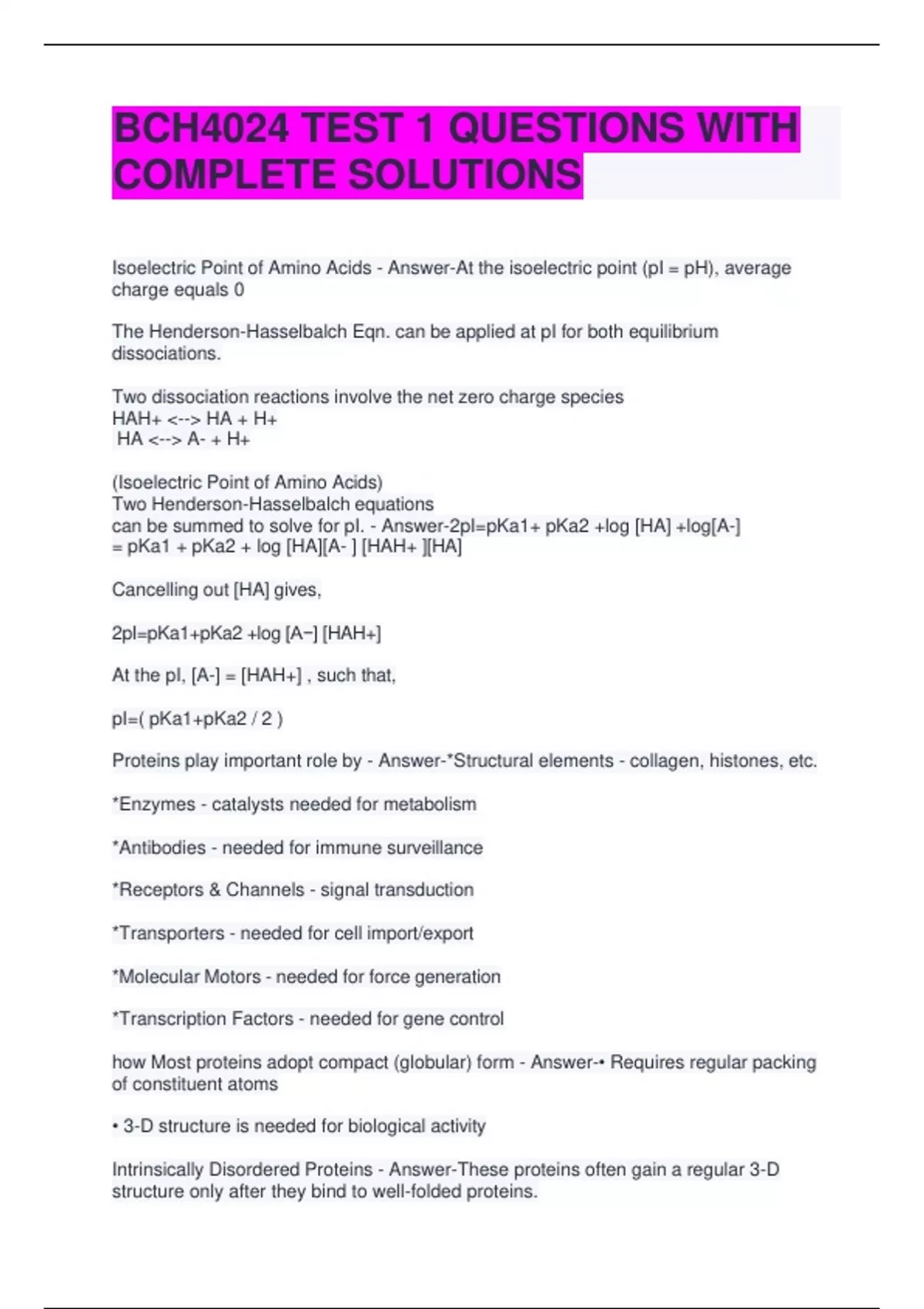 BCH4024 TEST 1 QUESTIONS WITH COMPLETE SOLUTIONS Isoelectric Point of Amino Acids - Answer-At the isoelectric point (pI = pH), average charge equals 0 The Henderson-Hasselbalch Eqn. can be applied at pI for both equilibrium dissociations. Two dissociation reactions involve the net zero charge species HAH+ -- HA + H+ HA -- A- + H+ (Isoelectric Point of Amino Acids) Two Henderson-Hasselbalch equations can be summed to solve for pI. - Answer-2pI=pKa1+ pKa2 +log [HA] +log[A-] = pKa1 + pKa2 + log [HA][A- ] [HAH+ ][HA] Cancelling out [HA] gives, 2pI=pKa1+pKa2 +log [A−] [HAH+] At the pI, [A-] = [HAH+] , such that, pI=( pKa1+pKa2 / 2 ) Proteins play important role by - Answer-*Structural elements - collagen, histones, etc. *Enzymes - catalysts needed for metabolism *Antibodies - needed for immune surveillance *Receptors & Channels - signal transduction *Transporters - needed for cell import/export *Molecular Motors - needed for force generation *Transcription Factors - needed for gene control how Most proteins adopt compact (globular) form - Answer-• Requires regular packing of constituent atoms • 3-D structure is needed for biological activity