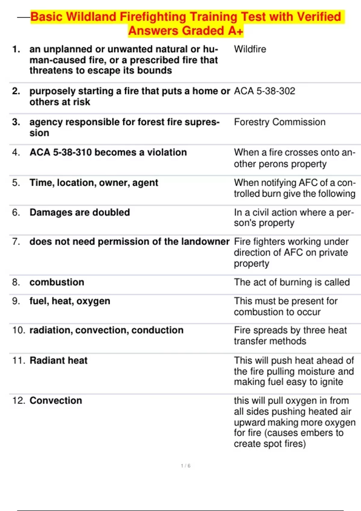 Basic Wildland Firefighting Training Test with Verified Answers Graded A+ 1. an unplanned or unwanted natural or hu- man-caused fire, or a prescribed fire that threatens to escape its bounds 2. purposely starting a fire that puts a home or others at risk 3. agency responsible for forest fire supres- sion Wildfire ACA 5-38-302 Forestry Commission 4. ACA 5-38-310 becomes a violation When