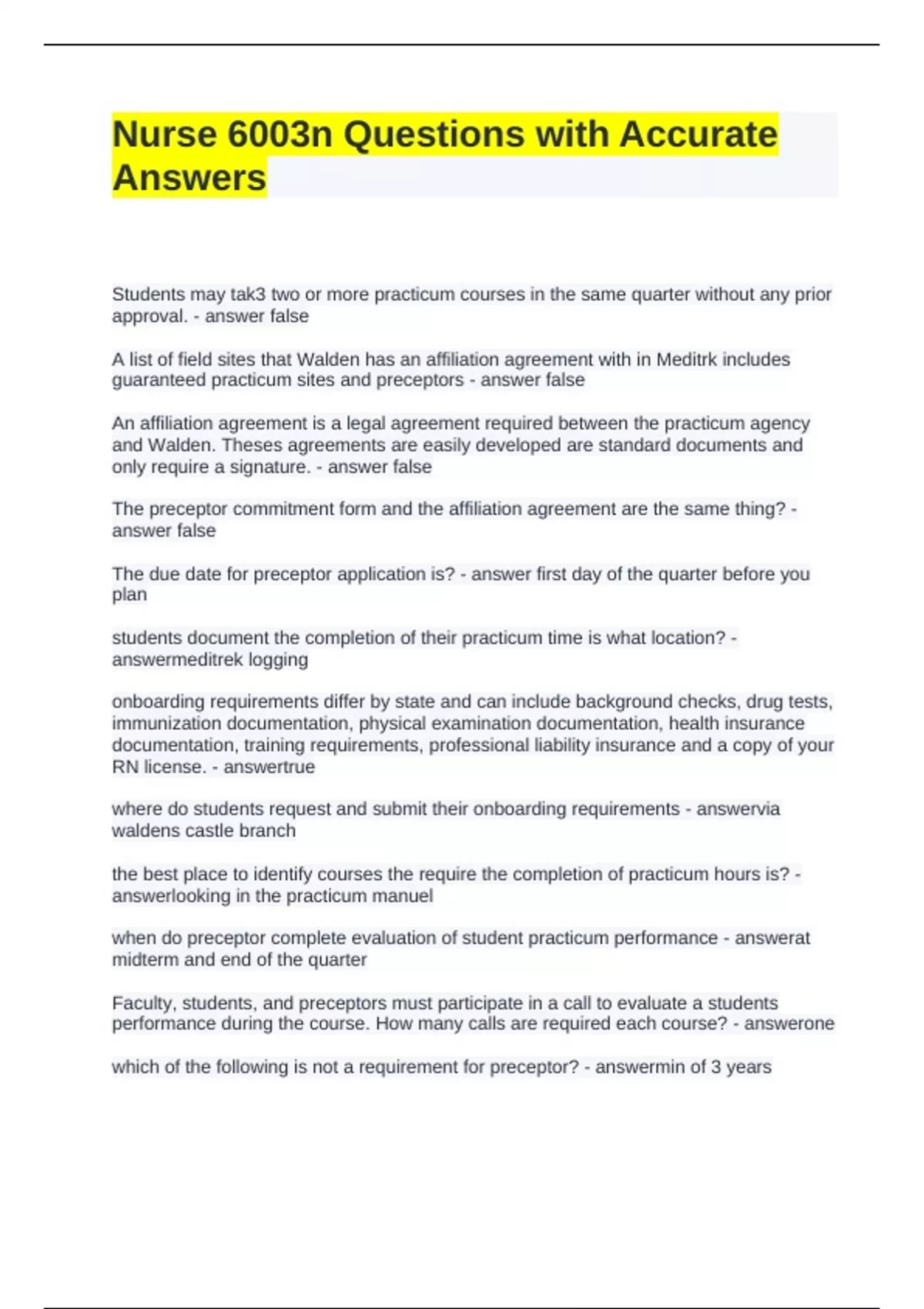 Nurse 6003n Questions with Accurate Answers Students may tak3 two or more practicum courses in the same quarter without any prior approval. false A list of field sites that walden has an affiliation agreement with in Meditrk includes guaranteed practicum sites and preceptors false An affiliation agreement is a legal agreement required between the practicum agency and walden. Theses argeements are easily developed are standard documents and only require a signature. false The preceptor commitment form and the affiliation agreement are the same thing? false The due date for preceptor application is? first day of the quarter before you plan students document the completion of their practicum time is what location? meditrek logging onboarding requirements differ by state and can include background checks, drug tests, immunization documentation, physical examination documentation, health insurance documentation, training requirements, professional liability insurance and a copy of your RN license. true where do students request and submit their onboarding requirements via waldens castle branch the best place to identify courses the require the completion of practicum hours is? looking in the practicum manuel when do preceptor complete evaluation of student practicum performance at midterm and end of the quarter Faculty, students, and preceptors must participate in a call to evaluate a students performance during the course. How many calls are required each course? one which of the following is not a requirement for preceptor? min of 3 years information that will need to be included in the practicum application includes? preceptor commitment form, preceptor license # and state, field site address and admi name when must onboarding requirement be completed? 4 wks prior to the start of practicum course students can monitor the statuss of their preceptor application by closely monitor their email from meditrek for status updates from the office of field experiences