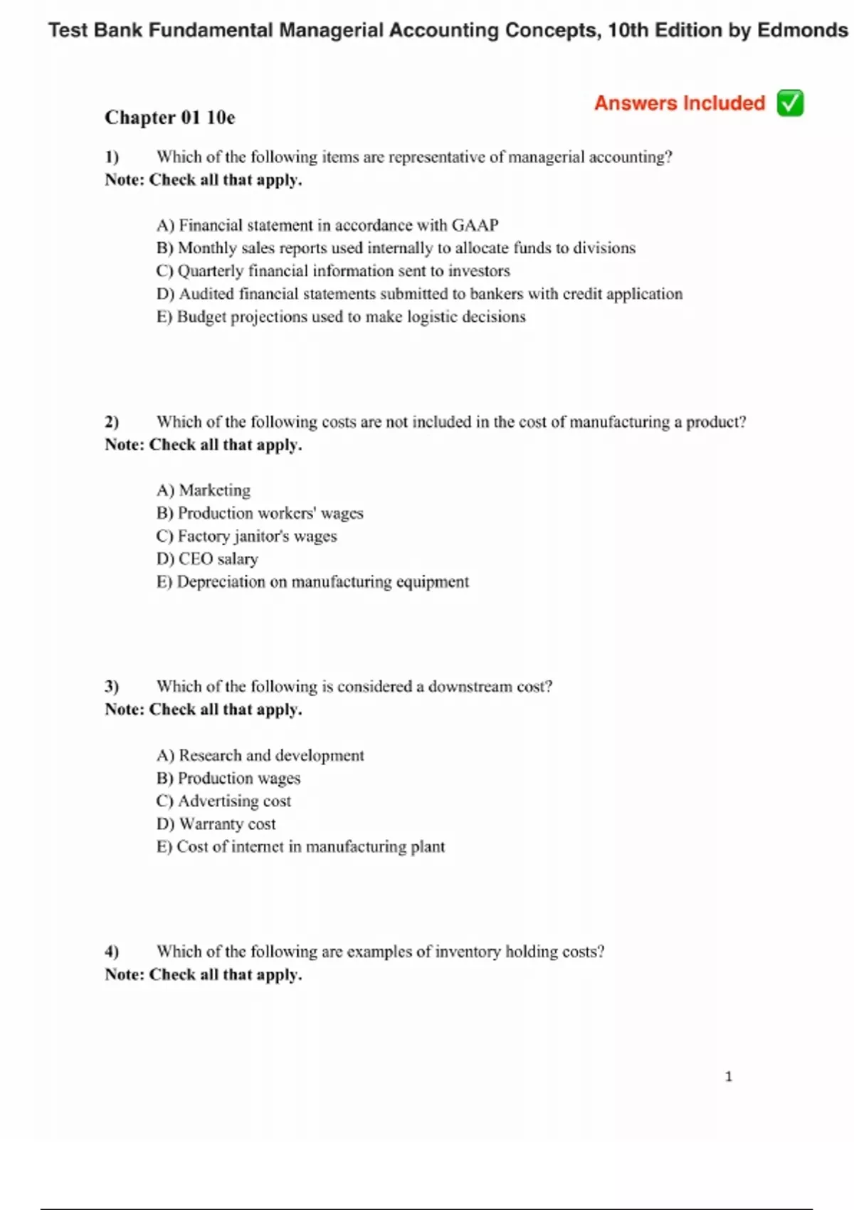 Test Bank for Fundamental Managerial Accounting Concepts 10e 10th Edition by Thomas Edmonds, Christopher Edmonds and Mark Edmonds and Philip Olds. ISBN-13: 0682 Full Chapters test bank included with Instant Download Chapter 1 Management Accounting and Corporate GovernanceChapter 2 Cost Behavior, Operating Leverage, and Profitability Analysis Chapter 3 Analysis of Cost, Volume, and Pricing to Increase Profitability Chapter 4 Cost Accumulation, Tracing, and Allocation Chapter 5 Cost Management in an Automated Business Environment: ABC, ABM, and TQM Chapter 6 Relevant Information for Special Decisions Chapter 7 Planning for Profit and Cost Control Chapter 8 Performance Evaluation Chapter 9 Responsibility Accounting Chapter 10 Planning for Capital Investments Chapter 11 Product Costing in Service and Manufacturing Entities Chapter 12 Job-Order, Process, and Hybrid Costing Systems Chapter 13 Financial Statement Analysis Chapter 14 Statement of Cash Flows