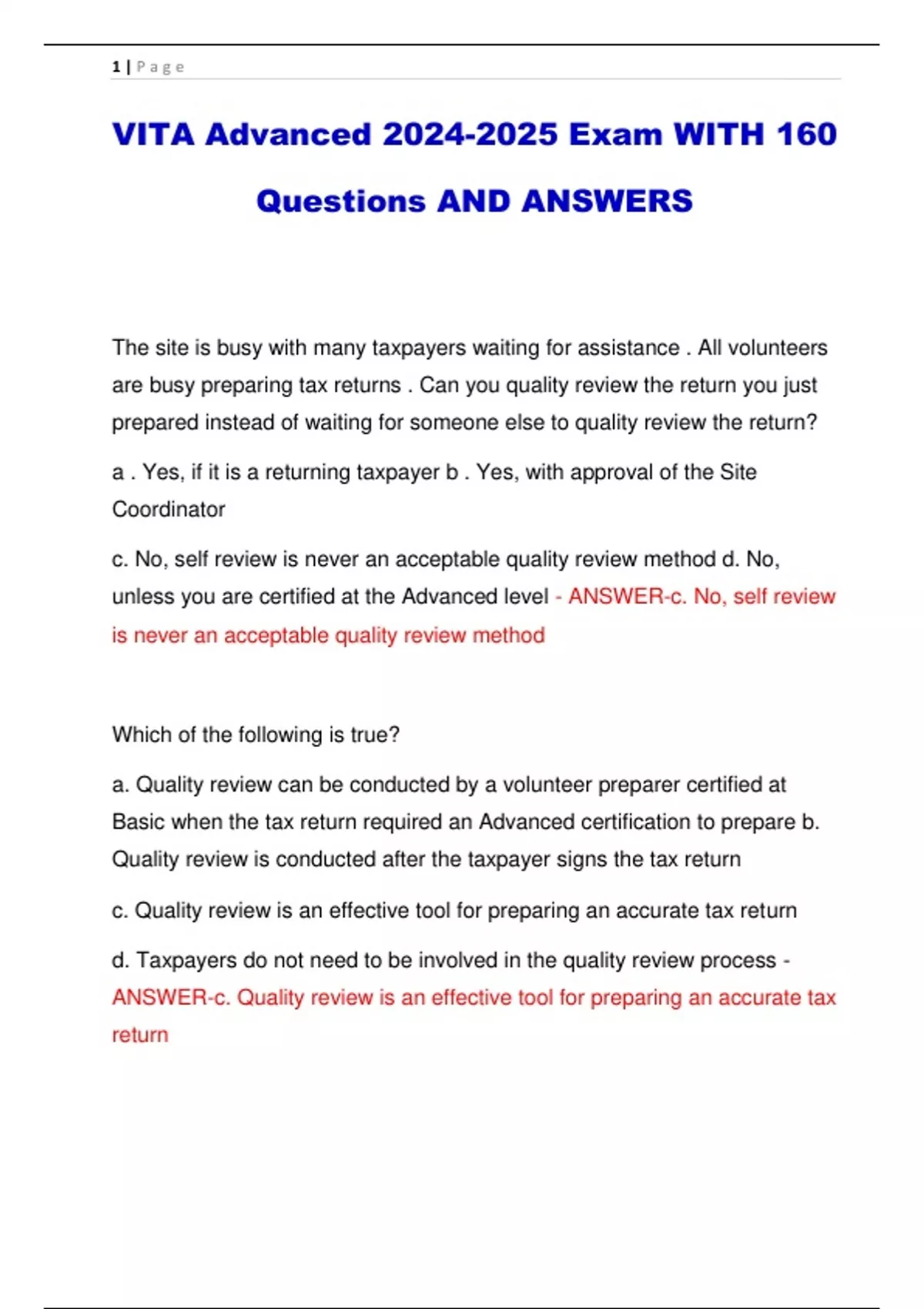 VITA Advanced Exam WITH 160 Questions AND ANSWERS The site is busy with many taxpayers waiting for assistance . All volunteers are busy preparing tax returns . Can you quality review the return you just prepared instead of waiting for someone else to quality review the return? a . Yes, if it is a returning taxpayer b . Yes, with approval of the Site Coordinator c. No, self review is never an acceptable quality review method d. No, unless you are certified at the Advanced level - ANSWER-c. No, self review is never an acceptable quality review method Which of the following is true? a. Quality review can be conducted by a volunteer preparer certified at Basic when the tax return required an Advanced certification to prepare b. Quality review is conducted after the taxpayer signs the tax return c. Quality review is an effective tool for preparing an accurate tax return d. Taxpayers do not need to be involved in the quality review process - ANSWER-c. Quality review is an effective tool for preparing an accurate tax return 2 | P a g e As part of the intake process, each site must: a. Have a process to ensure a return is within the scope of the VITA/TCE Programs b. Identify the certification level needed to prepare a return c. Have a process to ensure volunteers have the certification needed for the returns they prepare d. All of the above - ANSWER-d. All of the above When should an IRS-certified volunteer preparer participating in the VITA/TCE Programs perform a complete interview of a taxpayer? a. Only when the taxpayer has questions b. Only if the taxpayer has never visited your site c. Only when the site is not busy d. For every return prepared at the site - ANSWER-d. For every prepared tax return The certified volunteer preparer should verify the return is within their certification level as part of the Intake/Interview process. - ANSWER-True When reviewing Form 13614-C, you see the "Interest" question is marked "Yes" and the taxpayer gives you a Form 1099-INT. What should you do next? - ANSWER-c. ask the taxpayer if they had any other interest income 3 | P a g e True or False: VITA and TCE sites are required to conduct quality reviews of every return prepared at the site. - ANSWER-True A taxpayer tells you that they had health insurance coverage for the entire year, but they did not bring proof of the coverage. This information along with all other information gathered during your interview does not seem unusual or questionable. As a tax preparer, you should: - ANSWER-b. prepare the return using the information without seeing any proof of insurance coverage What information must a volunteer review to deter the possibility of identity theft? a. Form W-2 b. Photo identification c. Last year's tax return d. Medicaid card - ANSWER-b. photo identification Basic Scenario 1: Wendy Gordon. AGE: 20, is a U.S. citizen with valid SS. "Unsure" to question "Can anyone claim you or your spouse on their tax return?" - full time student during 2015 - only income for $6,500 in wages 4 | P a g e - lived with her parents all year, but they told her they will not claim her - does not provide more than half of her own support. - ANSWER- Which of the following statements is correct? a. Wendy must claim 0 exemptions, because her income was less than $10,000. b. Wendy must claim 0 exemptions, because her parents can claim her as a dependent on their tax return. CORRECT c. Wendy can claim 1 exemption, because she had earned income. d. Wendy can claim 1 exemption, because her parents have decided not to claim her. Using Publication 4012, Who Must File tab, Chart B, is Wendy required to file a tax return? a. Yes CORRECT b. No Basic Scenario 2: