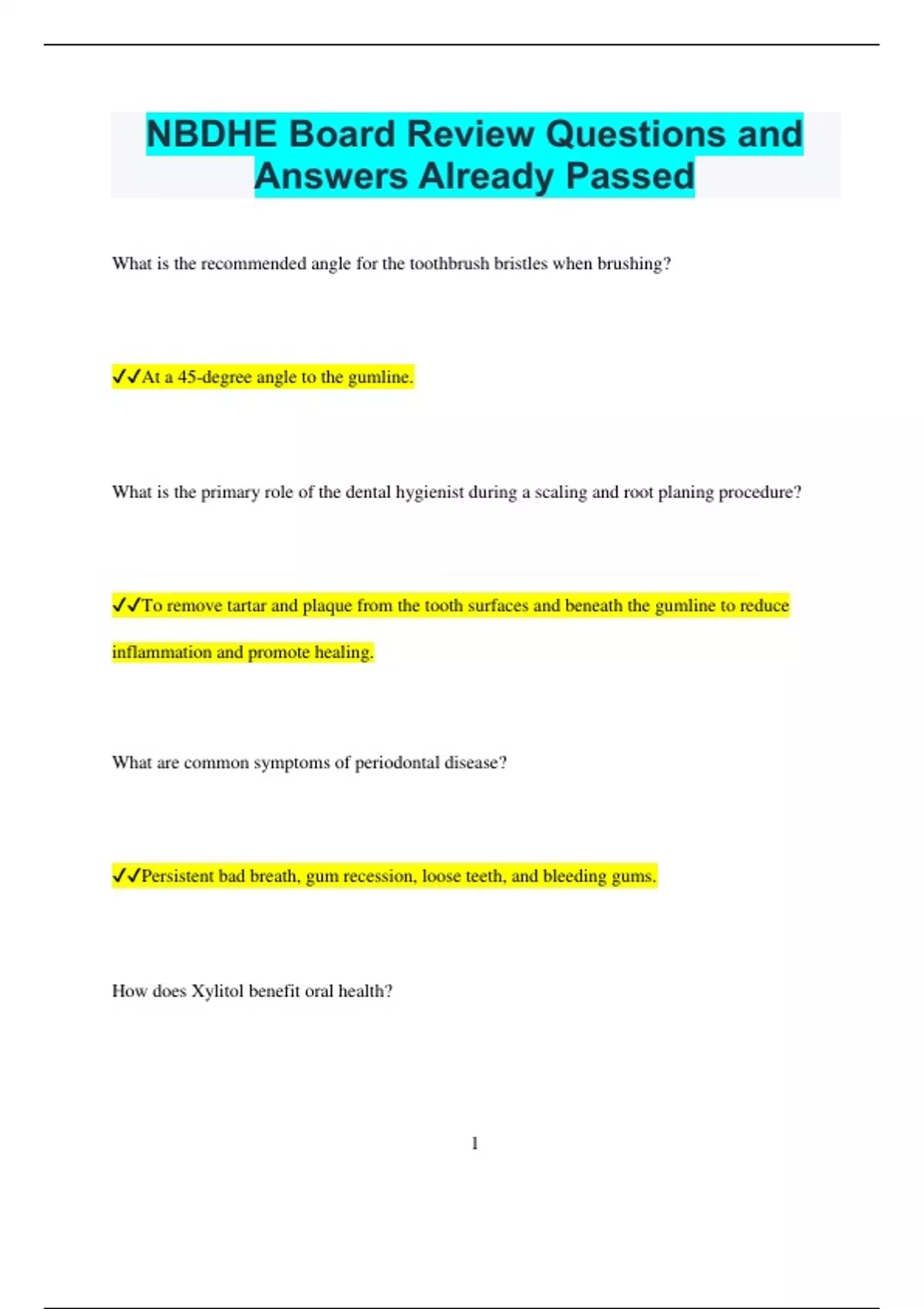 NBDHE Board Review Questions and Answers Already Passed What is the recommended angle for the toothbrush bristles when brushing? At a 45-degree angle to the gumline. What is the primary role of the dental hygienist during a scaling and root planing procedure? To remove tartar and plaque from the tooth surfaces and beneath the gumline to reduce inflammation and promote healing. What are common symptoms of periodontal disease? Persistent bad breath, gum recession, loose teeth, and bleeding gums. How does Xylitol benefit oral health? 2 It helps reduce the growth of bacteria that cause tooth decay and can decrease the formation of cavities. What is the significance of the DMFT index in dental health assessments? It measures the number of Decayed, Missing, and Filled Teeth to assess overall dental health and treatment needs. How should a dental hygienist manage a patient with a history of heart disease during treatment? Review the patient's medical history, ensure they are taking their medications as prescribed, and potentially consult with their physician if needed. What is the main difference between anteriors and posteriors in terms of dental radiographs? Anterior teeth are shown in a vertical bitewing film, while posterior teeth are often displayed in a horizontal bitewing film for better visibility of interproximal areas. How often should patients with orthodontic appliances visit the dental hygienist for cleanings? 3 Every 4-6 weeks, as braces and other appliances can trap food and plaque more easily. What is the purpose of an oral cancer screening? To detect any early signs of oral cancer, such as unusual sores or growths, to ensure early diagnosis and treatment. How should a dental hygienist respond