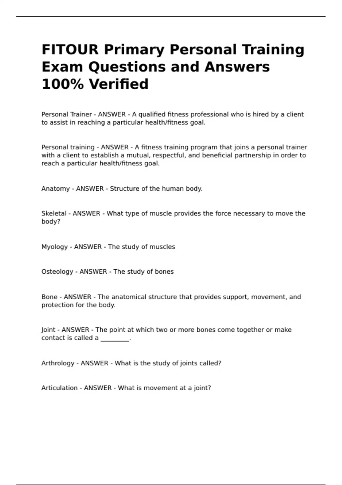 FITOUR Primary Personal Training Exam Questions and Answers 100% VerifiedFITOUR Primary Personal Training Exam Questions and Answers 100% VerifiedFITOUR Primary Personal Training Exam Questions and Answers 100% Verified Personal Trainer - ANSWER - A qualified fitness professional who is hired by a client to assist in reaching a particular health/fitness goal. Personal training - ANSWER - A fitness training program that joins a personal trainer with a client to establish a mutual, respectful, and beneficial partnership in order to reach a particular health/fitness goal. Anatomy - ANSWER - Structure of the human body.