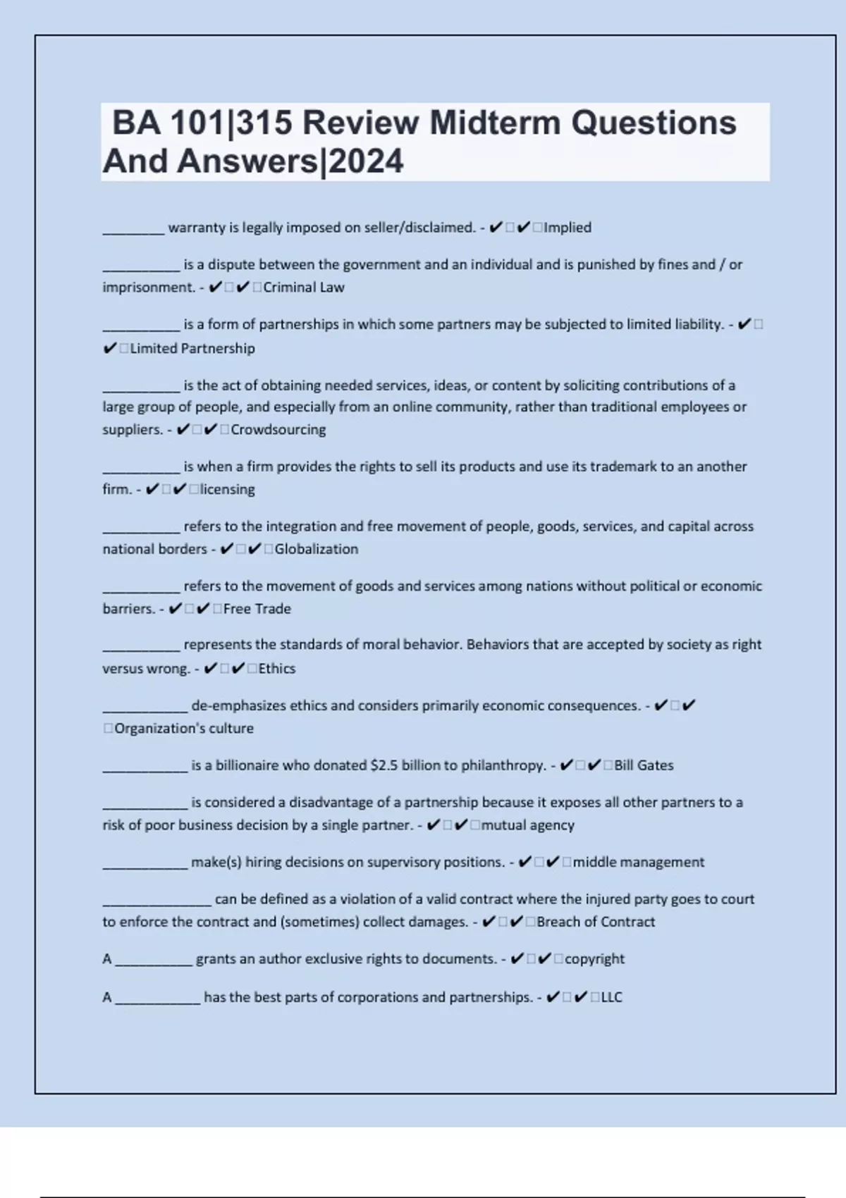BA 101|315 Review Midterm Questions And Answers|2024 |55 Pages