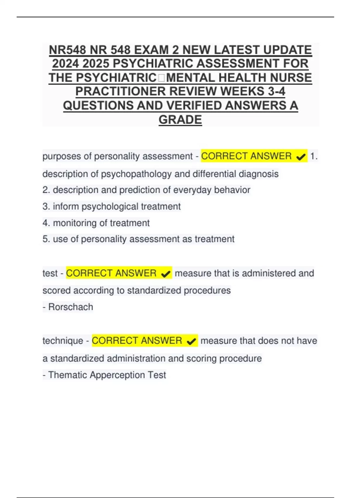 purposes of personality assessment - CORRECT ANSWER ️ 1. description of psychopathology and differential diagnosis 2. description and prediction of everyday behavior 3. inform psychological treatment 4. monitoring of treatment 5. use of personality assessment as treatment test - CORRECT ANSWER ️ measure that is administered and scored according to standardized procedures - Rorschach