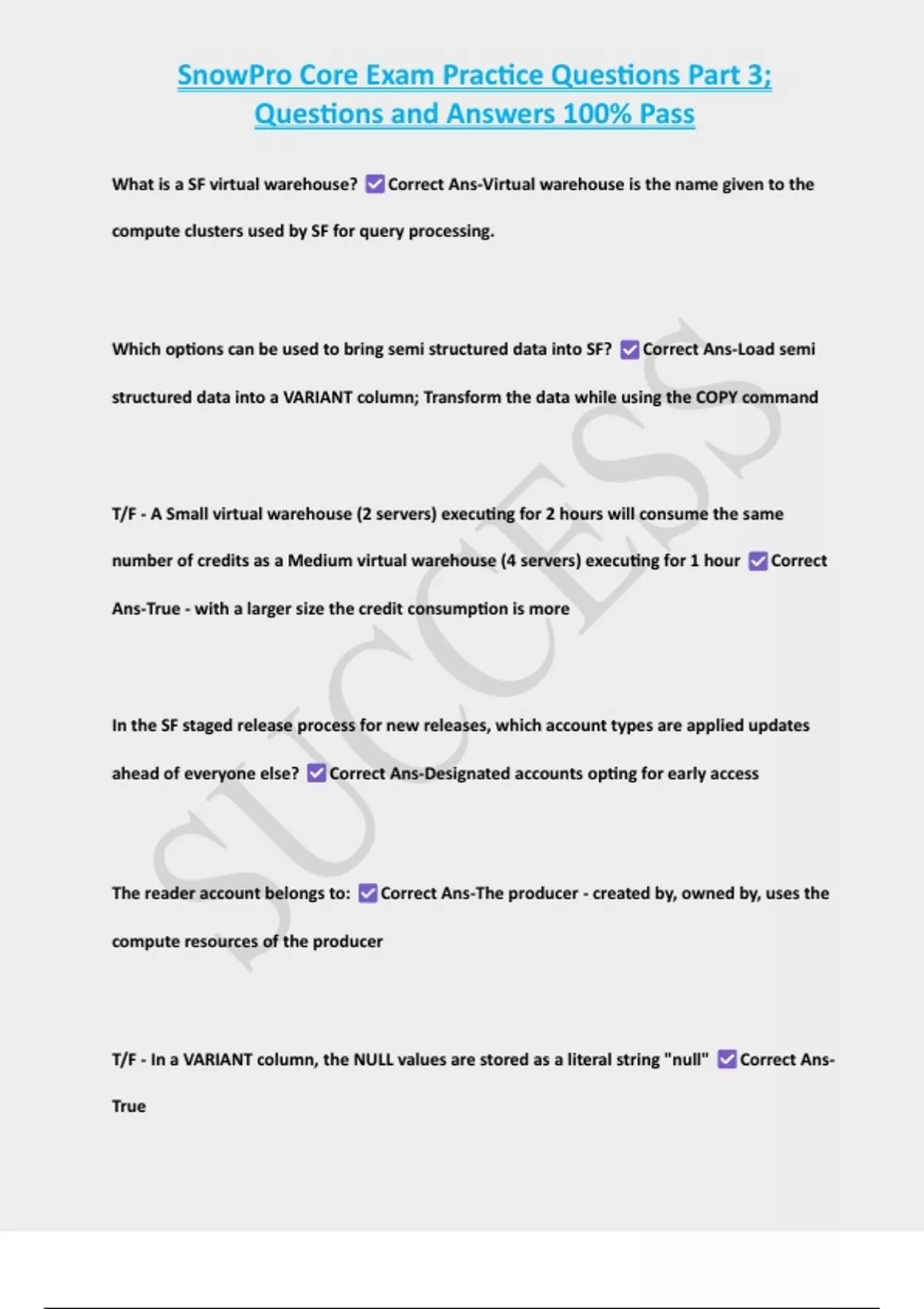 SnowPro Core Exam Practice Questions Part 3; Questions and Answers 100% Pass
