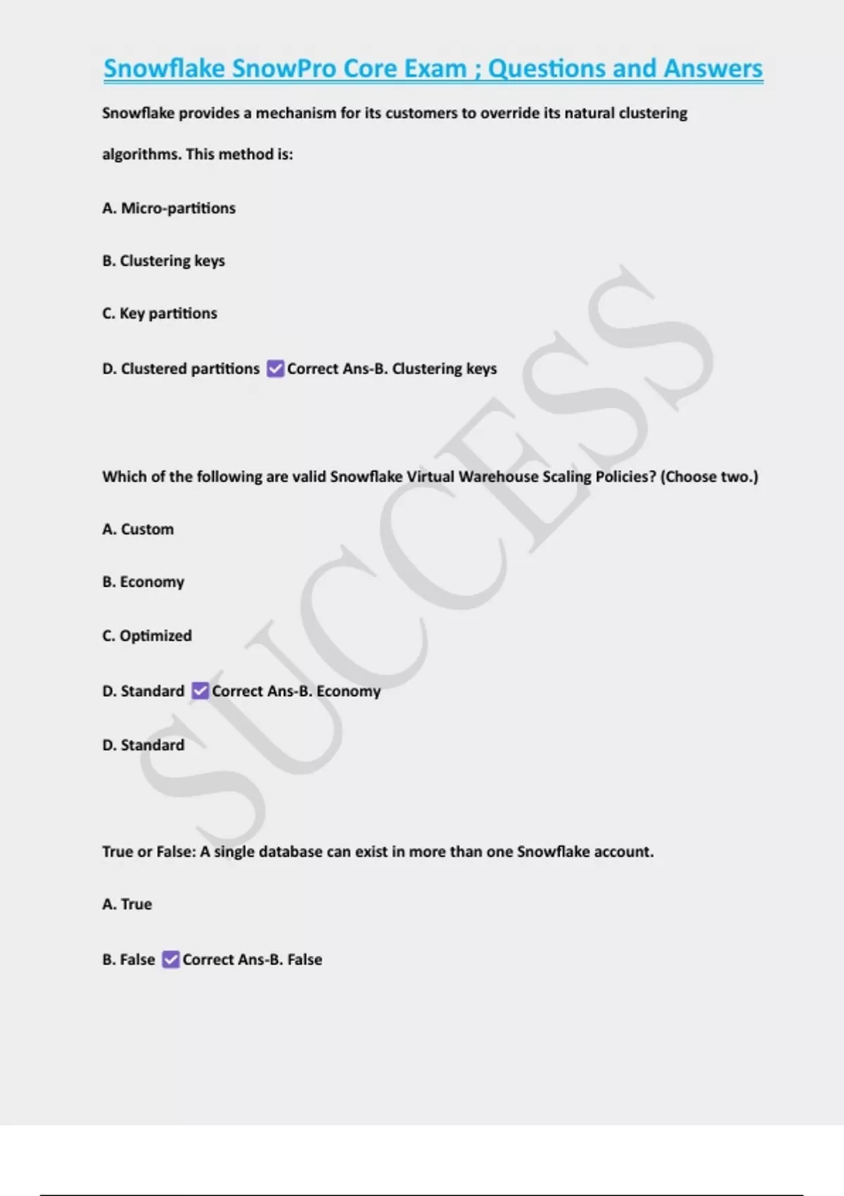 ,Snowflake SnowPro Core Exam ; Questions and Answers