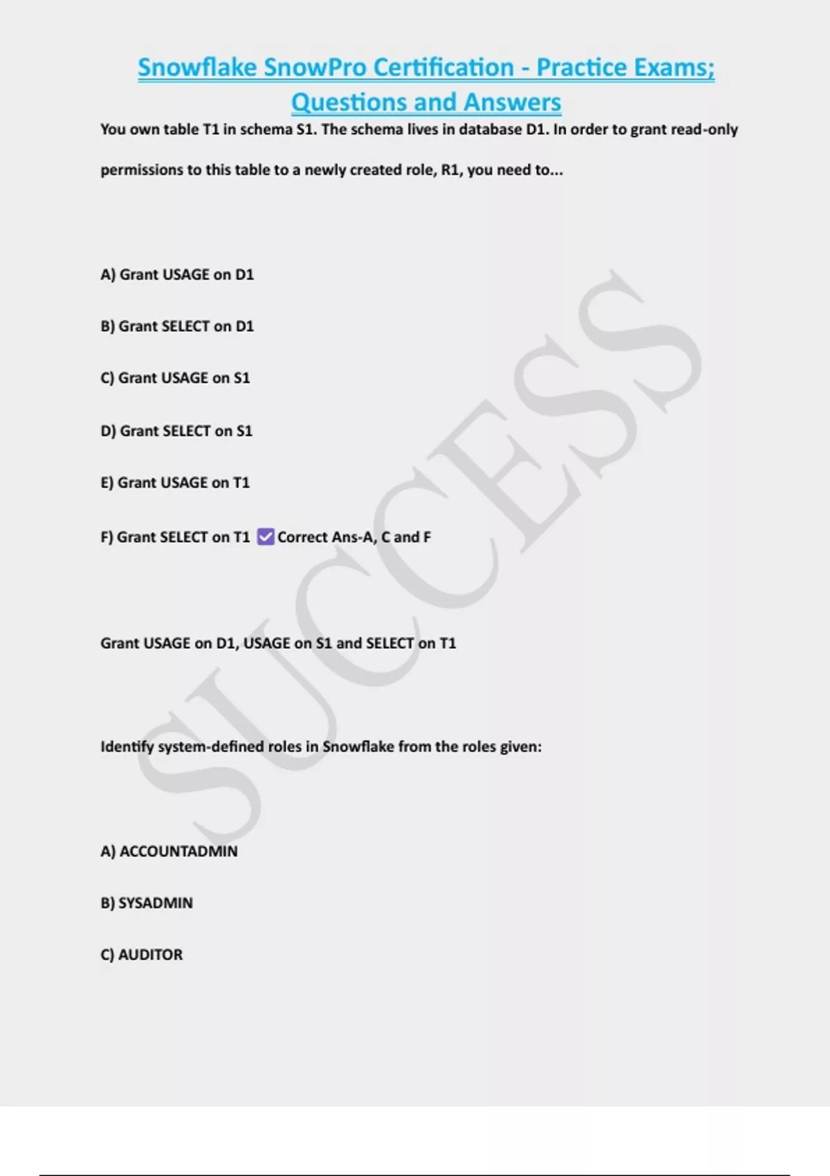 F) Grant SELECT on T1 Correct Ans-A, C and F