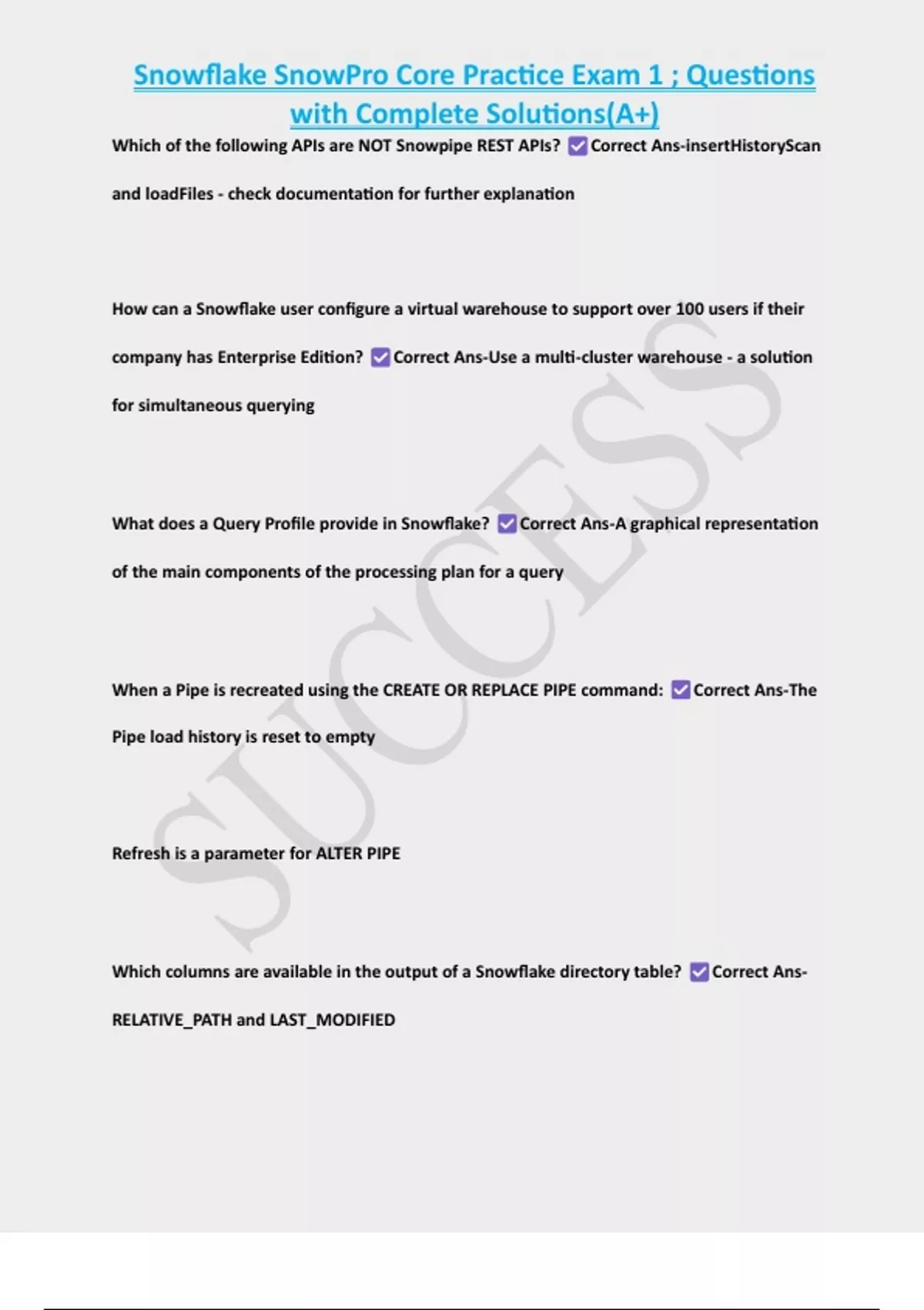 Snowflake SnowPro Core Practice Exam 1 ; Questions