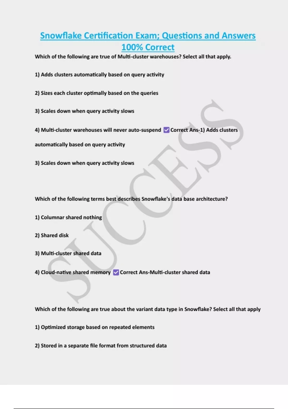 4) Multi-cluster warehouses will never auto-suspend Correct Ans-1) Adds clusters