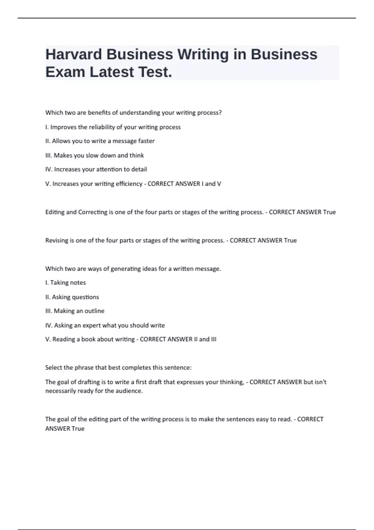 Harvard Business Writing in Business Exam Latest Test. Which two are benefits of understanding your writing process? I. Improves the reliability of your writing process II. Allows you to write a message faster III. Makes you slow down and think IV. Increases your attention to detail V. Increases your writing efficiency - CORRECT ANSWER I and V Editing and Correcting is one of the four parts or stages of the writing process. - CORRECT ANSWER True Revising is one of the four parts or stages of the writing process. - CORRECT ANSWER True Which two are ways of generating ideas for a written message. I. Taking notes II. Asking questions III. Making an outline IV. Asking an expert what you should write V. Reading a book about writing - CORRECT ANSWER II and III Select the phrase that best completes this sentence: The goal of drafting is to write a first draft that expresses your thinking, - CORRECT ANSWER but isn't necessarily ready for the audience.