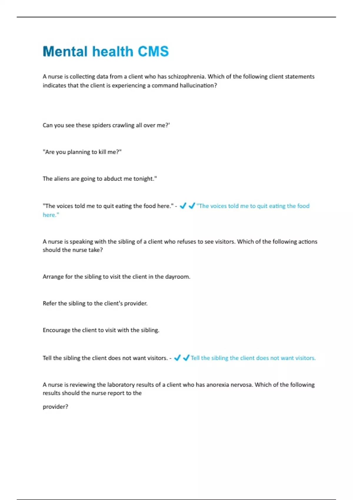 A nurse is collecting data from an adult client in an outpatient mental health clinic. The nurse should