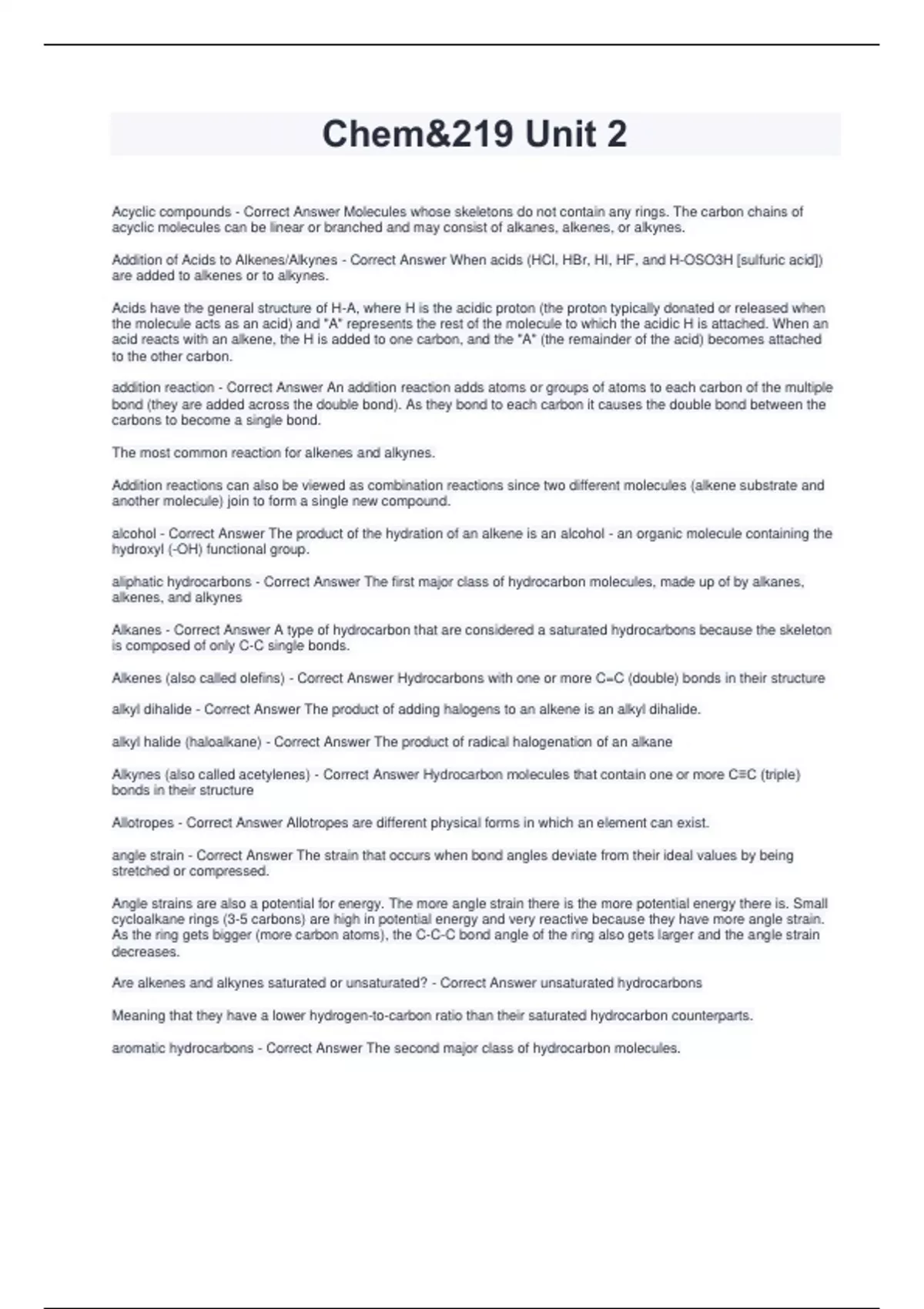 Acyclic compounds - Correct Answer Molecules whose skeletons do not contain any rings. The carbon chains of acyclic molecules can be linear or branched and may consist of alkanes, alkenes, or alkynes. Addition of Acids to Alkenes/Alkynes - Correct Answer When acids (HCl, HBr, HI, HF, and H-OSO3H [sulfuric acid]) are added to alkenes or to alkynes. Acids have the general structure of H-A, where H is the acidic proton (the proton typically donated or released when the molecule acts as an acid) and "A" represents the rest of the molecule to which the acidic H is attached. When an acid reacts with an alkene, the H is added to one carbon, and the "A" (the remainder of the acid) becomes attached to the other carbon. addition reaction - Correct Answer An addition reaction adds atoms or groups of atoms to each carbon of the multiple bond (they are added across the double bond). As they bond to each carbon it causes the double bond between the carbons to become a single bond. The most common reaction for alkenes and alkynes. Addition reactions can also be viewed as combination reactions since two different molecules (alkene substrate and another molecule) join to form a single new compound. alcohol - Correct Answer The product of the hydration of an alkene is an alcohol - an organic molecule containing the hydroxyl (-OH) functional group. aliphatic hydrocarbons - Correct Answer The first major class of hydrocarbon molecules, made up of by alkanes, alkenes, and alkynes Alkanes - Correct Answer A type of hydrocarbon that are considered a saturated hydrocarbons because the skeleton is composed of only C-C single bonds. Alkenes (also called olefins) - Correct Answer Hydrocarbons with one or more C=C (double) bonds in their structure alkyl dihalide - Correct Answer The product of adding halogens to an alkene is an alkyl dihalide. alkyl halide (haloalkane) - Correct Answer The product of radical halogenation of an alkane Alkynes (also called acetylenes) - Correct Answer Hydrocarbon molecules that contain one or more C≡C (triple) bonds in their structure Allotropes - Correct Answer Allotropes are different physical forms in which an element can exist. angle strain - Correct Answer The strain that occurs when bond angles deviate from their ideal values by being stretched or compressed. Angle strains are also a potential for energy. The more angle strain there is the more potential energy there is. Small cycloalkane rings (3-5 carbons) are high in potential energy and very reactive because they have more angle strain. As the ring gets bigger (more carbon atoms), the C-C-C bond angle of the ring also gets larger and the angle strain decreases. Are alkenes and alkynes saturated or unsaturated? - Correct Answer unsaturated hydrocarbons Meaning that they have a lower hydrogen-to-carbon ratio than their saturated hydrocarbon counterparts. aromatic hydrocarbons - Correct Answer The second major class of hydrocarbon molecules.