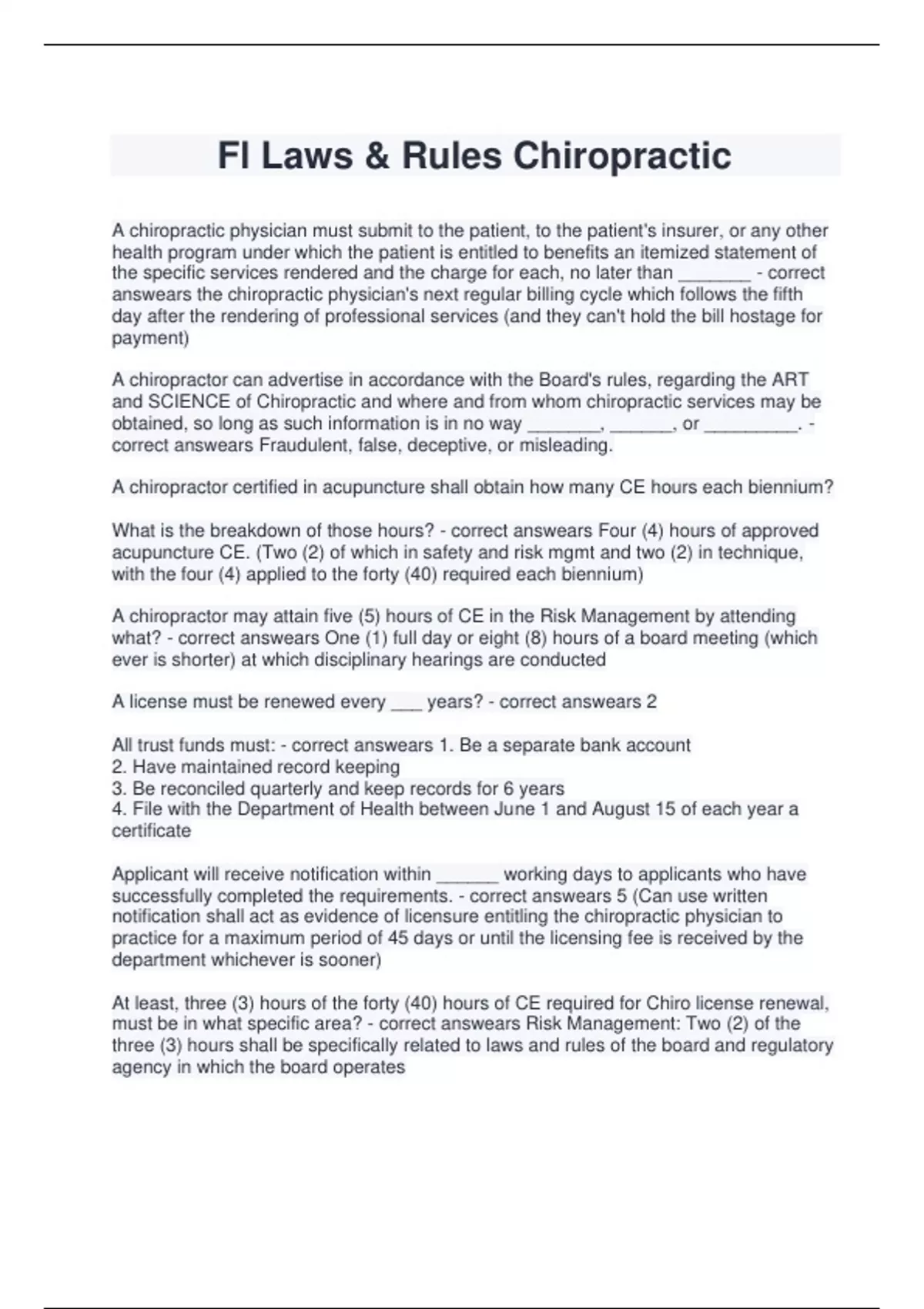 A chiropractic physician must submit to the patient, to the patient's insurer, or any other health program under which the patient is entitled to benefits an itemized statement of the specific services rendered and the charge for each, no later than _______ - correct answears the chiropractic physician's next regular billing cycle which follows the fifth day after the rendering of professional services (and they can't hold the bill hostage for payment) A chiropractor can advertise in accordance with the Board's rules, regarding the ART and SCIENCE of Chiropractic and where and from whom chiropractic services may be obtained, so long as such information is in no way _______, ______, or _________. - correct answears Fraudulent, false, deceptive, or misleading. A chiropractor certified in acupuncture shall obtain how many CE hours each biennium? What is the breakdown of those hours? - correct answears Four (4) hours of approved acupuncture CE. (Two (2) of which in safety and risk mgmt and two (2) in technique, with the four (4) applied to the forty (40) required each biennium) A chiropractor may attain five (5) hours of CE in the Risk Management by attending what? - correct answears O