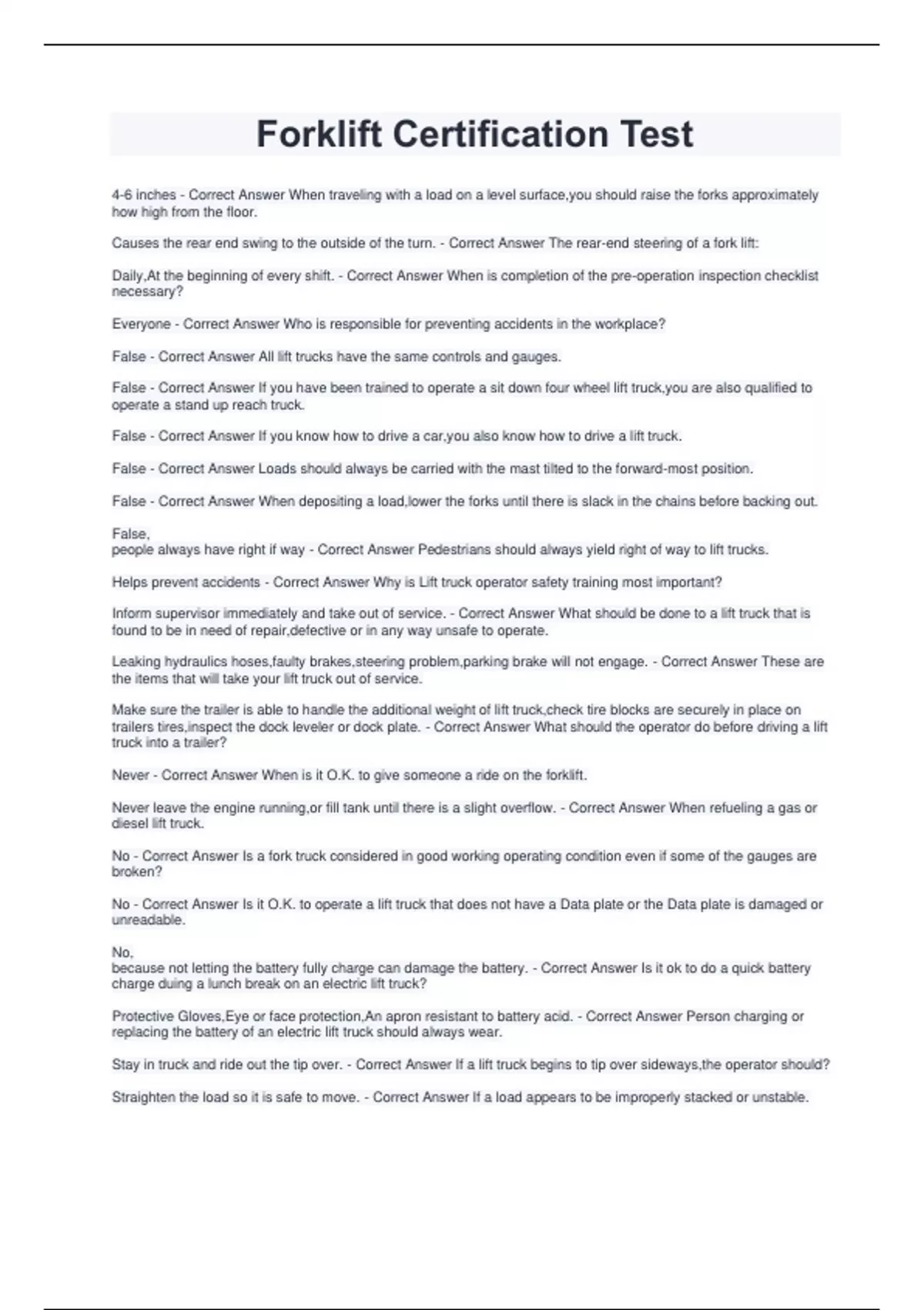 4-6 inches - Correct Answer When traveling with a load on a level surface,you should raise the forks approximately how high from the floor. Causes the rear end swing to the outside of the turn. - Correct Answer The rear-end steering of a fork lift: Daily,At the beginning of every shift. - Correct Answer When is completion of the pre-operation inspection checklist necessary? Everyone - Correct Answer Who is responsible for preventing accidents in the workplace? False - Correct Answer All lift trucks have the same controls and gauges. False - Correct Answer If you have been trained to operate a sit down four wheel lift truck,you are also qualified to operate a stand up reach truck. False - Correct Answer If you know how to drive a car,you also know how to drive a lift truck. False - Correct Answer Loads should always be carried with the mast tilted to the forward-most position. False - Correct Answer When depositing a load,lower the forks until there is slack in the chains before backing out. False, people always have right if way - Correct Answer Pedestrians should always yield right of way to lift trucks. Helps prevent accidents - Correct Answer Why is L