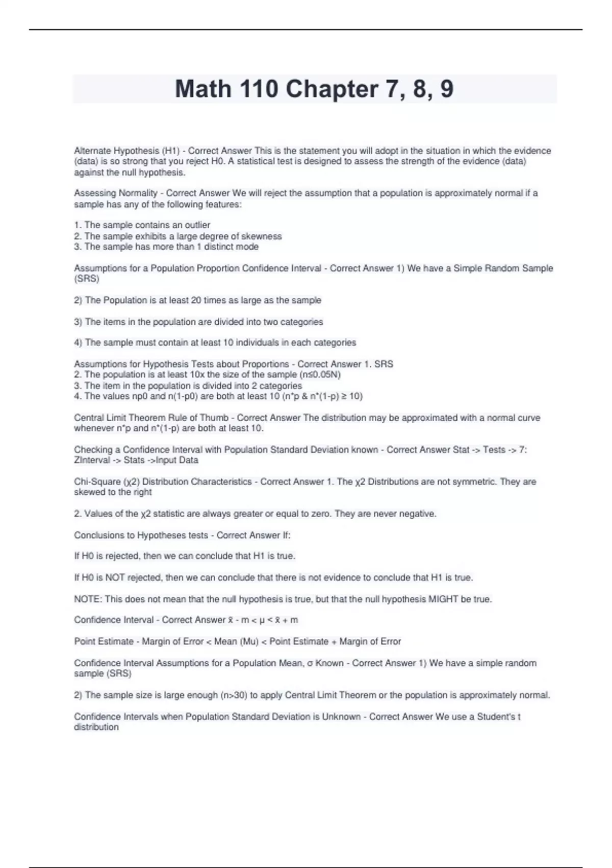 Alternate Hypothesis (H1) - Correct Answer This is the statement you will adopt in the situation in which the evidence (data) is so strong that you reject H0. A statistical test is designed to assess the strength of the evidence (data) against the null hypothesis. Assessing Normality - Correct Answer We will reject the assumption that a population is approximately normal if a sample has any of the following features: 1. The sample contains an outlier 2. The sample exhibits a large degree of skewness 3. The sample has more than 1 distinct mode Assumptions for a Population Proportion Confidence Interval - Correct Answer 1) We have a Simple Random Sample (SRS) 2) The Population is at least 20 times as large as the sample 3) The items in the population are divided into two categories 4) The sample must contain at least 10 individuals in each categories Assumptions for Hypothesis Tests about Proportions - Correct Answer 1. SRS 2. The population is at least 10x the size of the sample (n≤0.05N) 3. The item in the population is divided into 2 categories 4. The values np0 and n(1-p0) are both at least 10 (n*p & n*(1-p) ≥ 10) Central Limit Theorem Rule of Thumb - Correct Answer The distribution may be approximated with a normal curve whenever n*p and n*(1-p) are both at least 10. Checking a Confidence Interval with Population Standard Deviation known - Correct Answer Stat - Tests - 7: ZInterval - Stats -Input Data Chi-Square (χ2) Distribution Characteristics - Correct Answer 1. The χ2 Distributions are not symmetric. They are skewed to the right 2. Values of the χ2 statistic are always greater or equal to zero. They are never negative. Conclusions to Hypotheses tests - Correct Answer If: If H0 is rejected, then we can conclude that H1 is true. If H0 is NOT rejected, then we can conclude that there is not evidence to conclude that H1 is true. NOTE: This does not mean that the null hypothesis is true, but that the